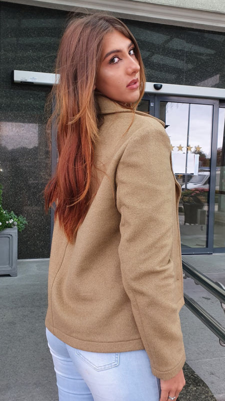 Beżowa damska kurtka Armani Exchange, cienka wiosenna, płaszczowa. Będzie też idealna na jesień. Ma ciekawy kolor, gdyż ciemny beż został w tym przypadku wzbogacony o odrobinę miodowego kolorytu. Bez kaptura, bez podszewki, cienka, idealna na wiosnę. Od spodu w kolorze intensywnym żółtym. Długie rękawy można podwijać, żeby pokazać ten żółty kolor, dzięki czemu kurtka staje się jeszcze bardziej atrakcyjna wizualnie. Szeroki kołnierz. Dwie duże boczne kieszenie. Duże dekoracyjne guziki w kolorze kurtki. Ciekawa mieszanka włókien, która zapewnia trwałość w użytkowaniu. Prać chemicznie.