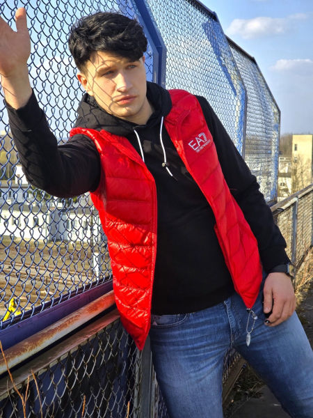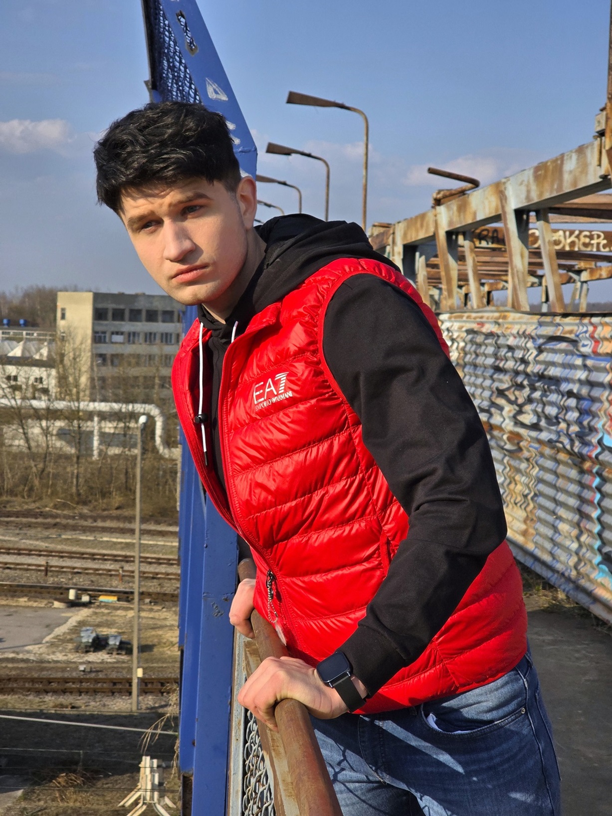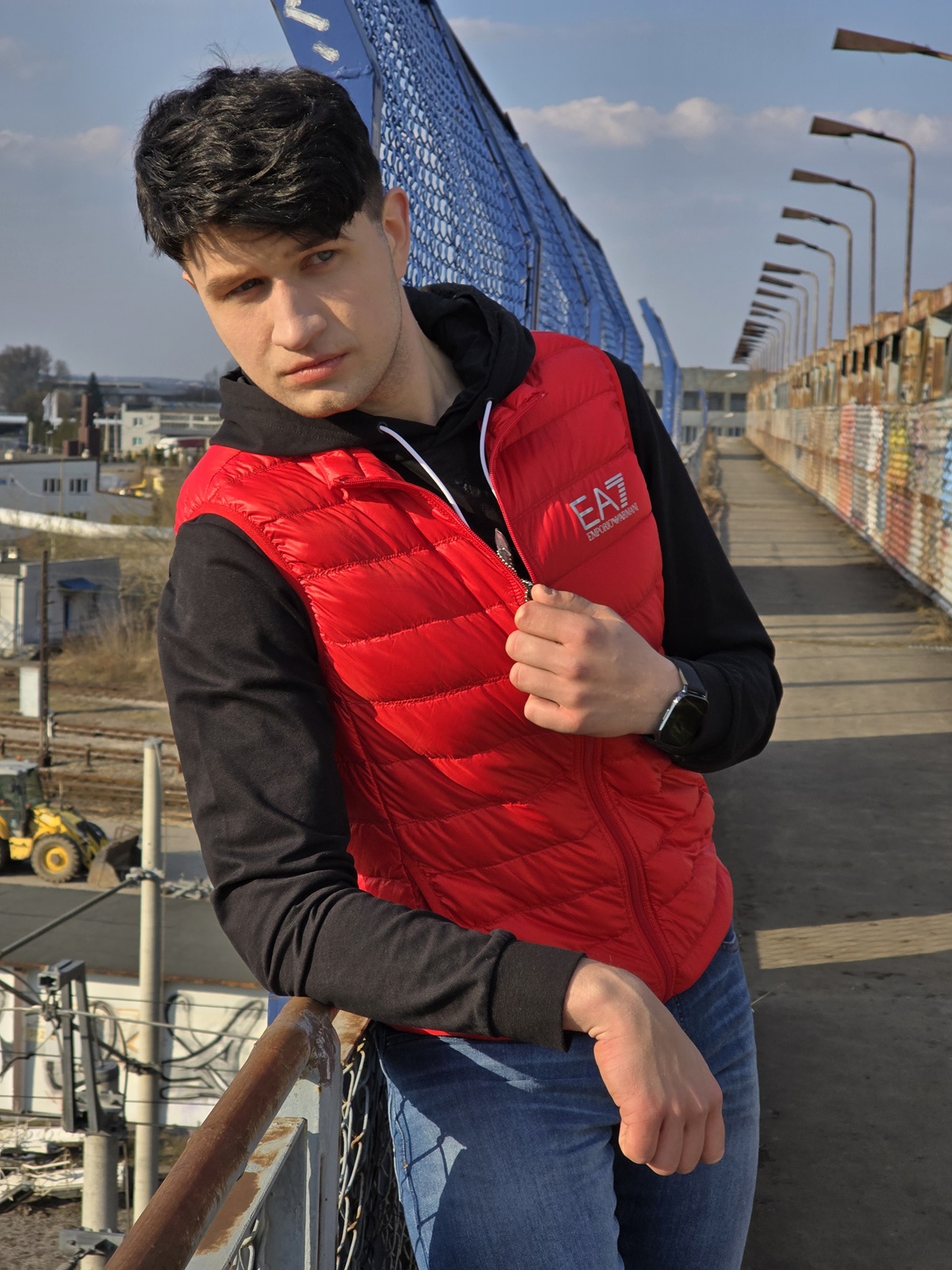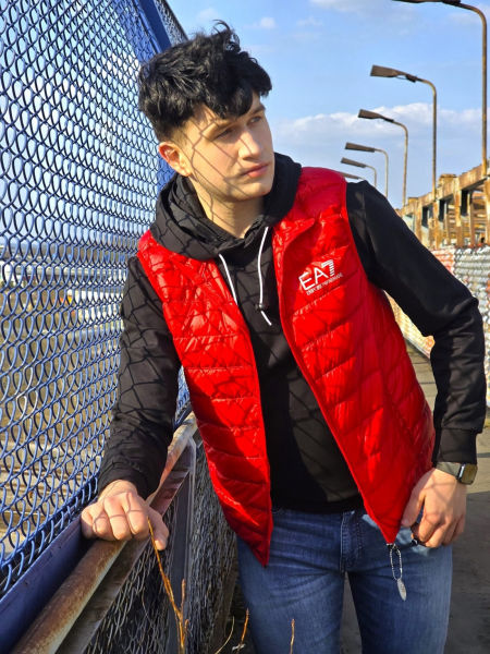 Puchowy bezrękawnik Emporio Armani EA7 bez kaptura. Lekki na wiosnę, letnie wieczory oraz wczesną jesień. Z przodu dwie kieszenie. Od frontu srebrzyste nadrukowane logo. Dół i kieszenie wykończone elastyczną czerwoną cienką lamówką. Zasuwany. Prać w pralce w 30 stopniach.
