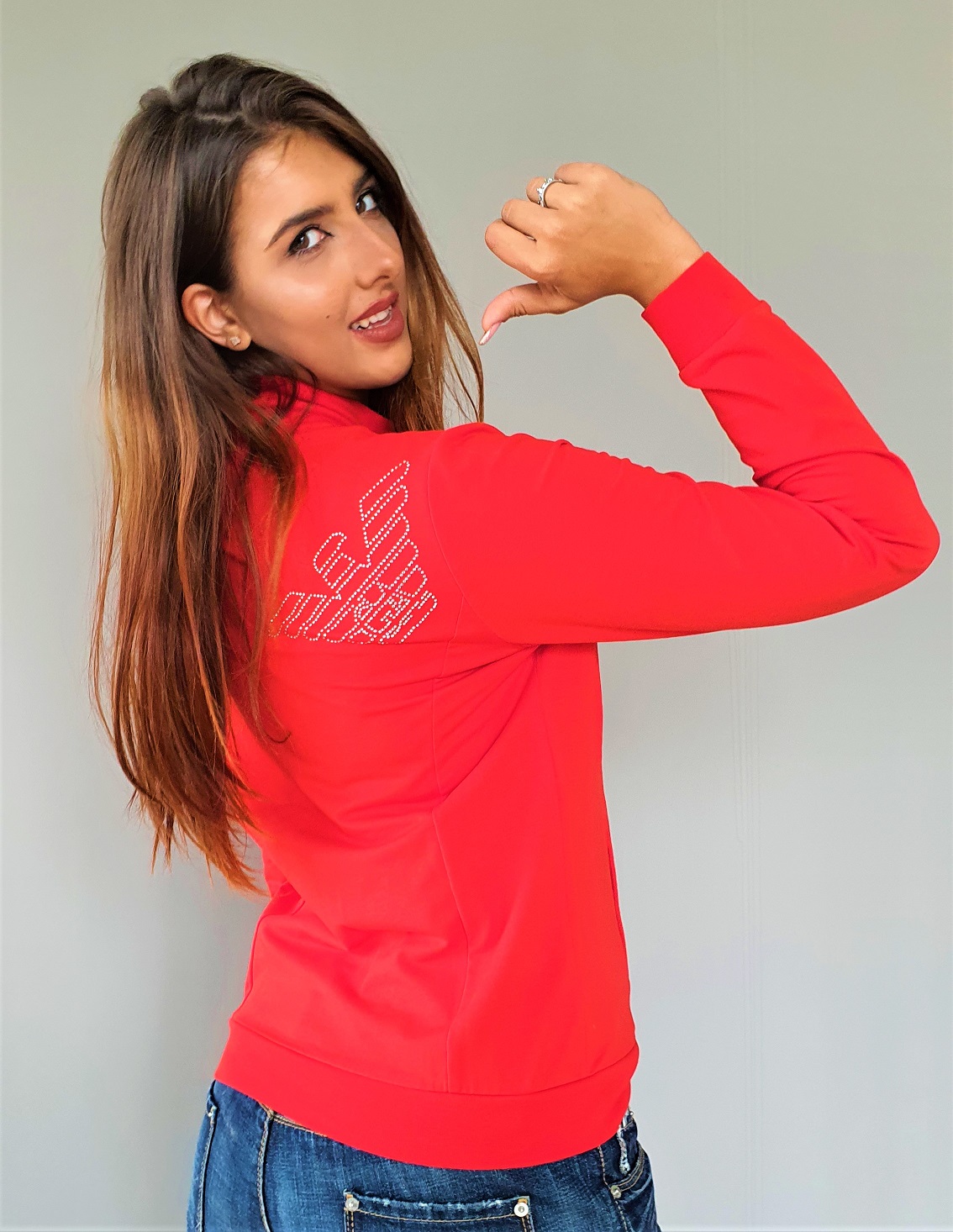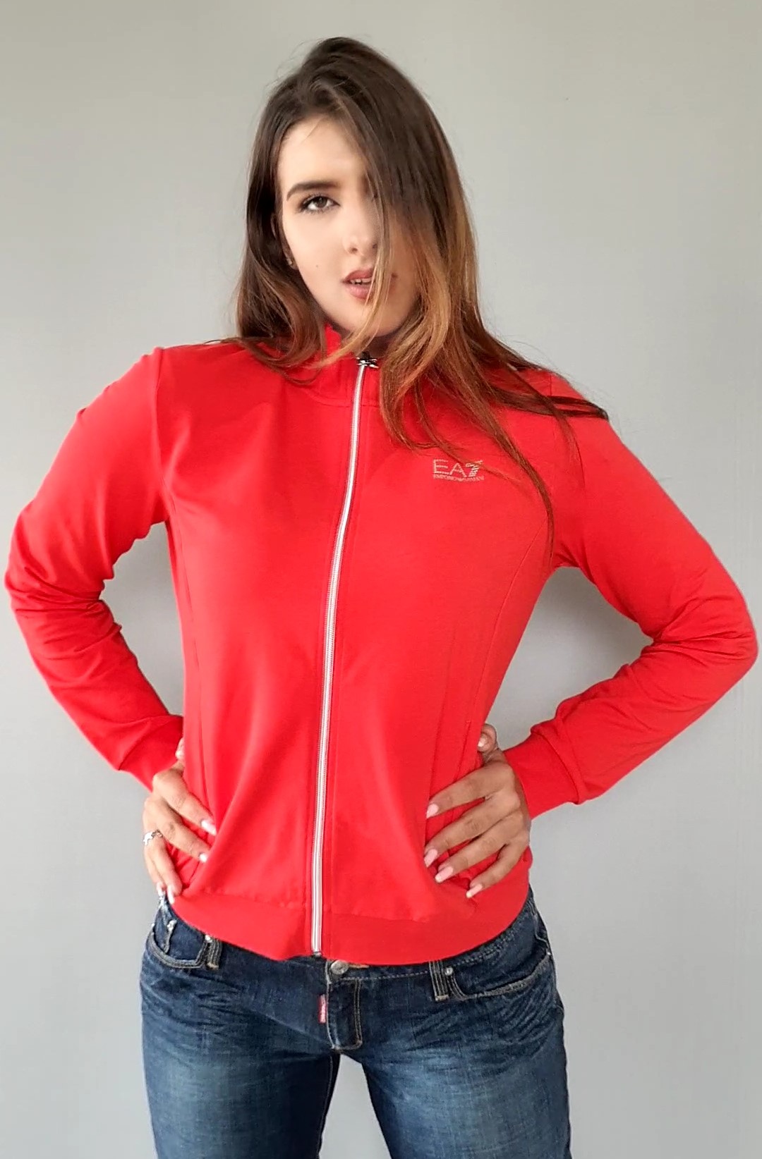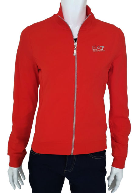 Czerwona damska bluza od dresu Emporio Armani EA7. Bardzo kobieca. Intensywna czerwień. Bez kaptura. Na suwak. Na froncie dyskretne, wysadzane kryształkami logo Emporio Armani EA7. Z tyłu na plecach wysadzany kryształkami orzeł charakterystyczny Armaniego. Z przodu dwie boczne kieszenie. Prać w 30 stopniach w pralce.