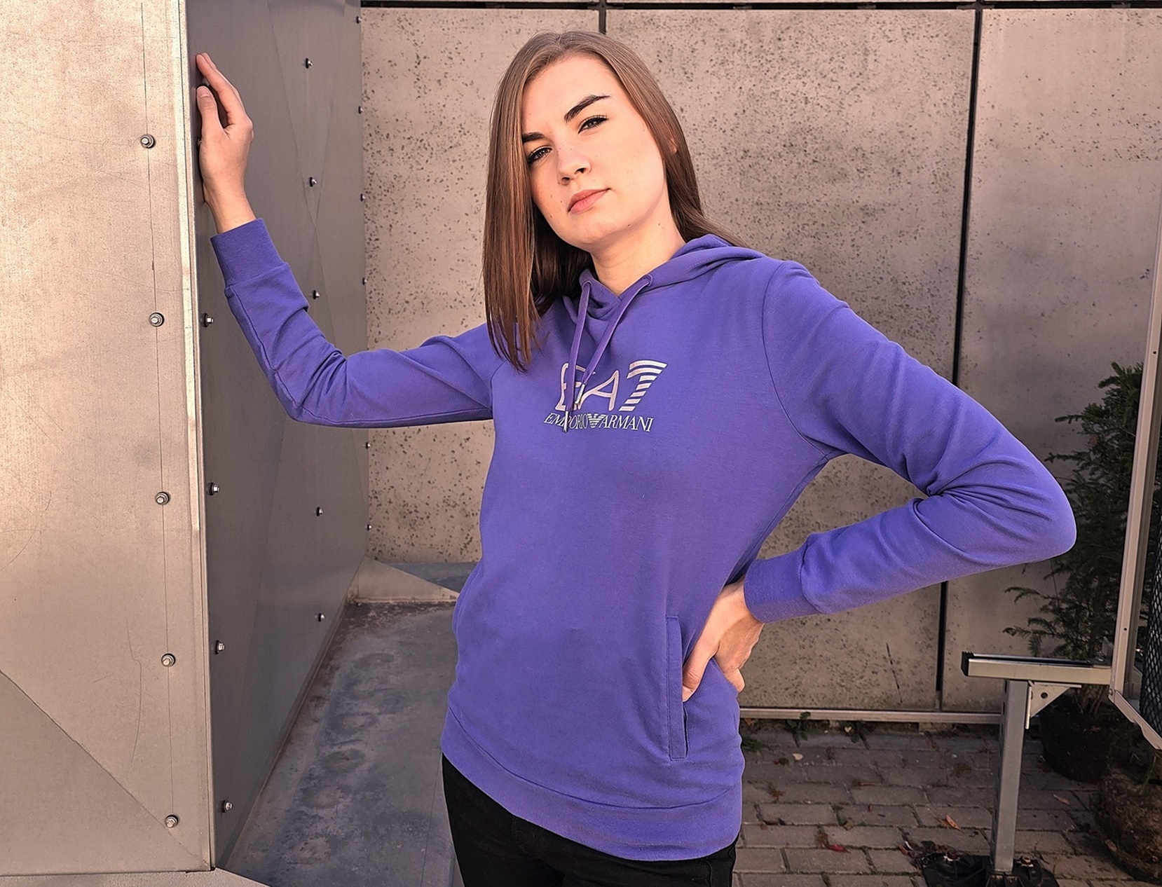 Sportowa damska bluza dresowa. Rzadko spotykany piękny kolor fioletowy typu lila. Bluza z kapturem i dwiema kieszeniami o frontu. Z przodu drukowany srebrnym brokatem napis EA7. Z tyłu na środku drugi mniejszy napis. Prać w 30 stopniach.