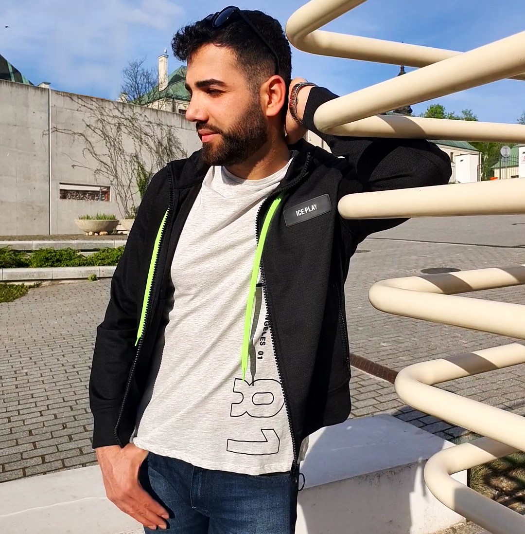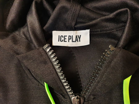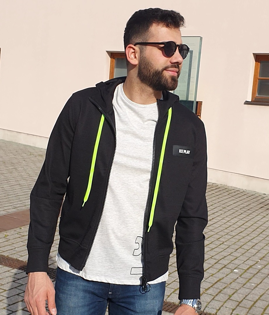 Czarna bluza z kapturem Ice Play, włoskiego domu mody ICEBERG. Zasuwana. Od frontu dekoracyjne troczki, ściągające kaptur w kolorze fluorescencyjnej zieleni. Na froncie przyszyty logotyp Ice Play. Dwie zasuwane kieszenie z przodu. Ciekawa faktura tkaniny. Prać chemicznie.