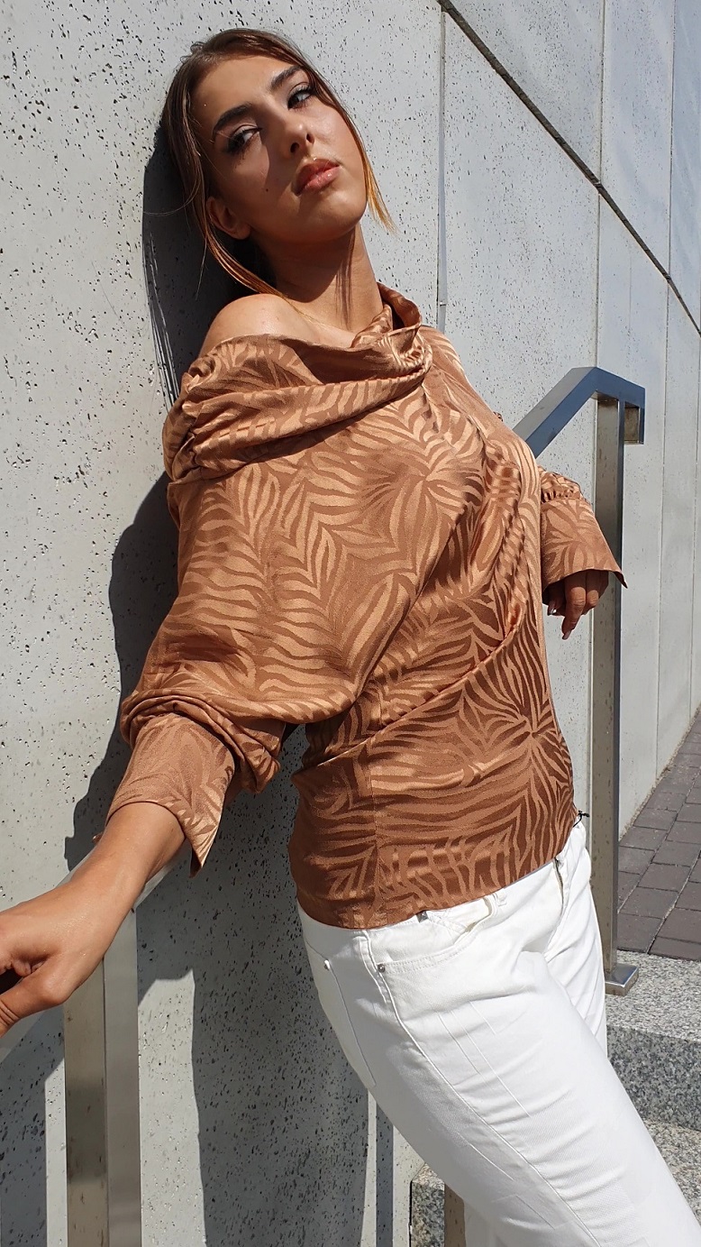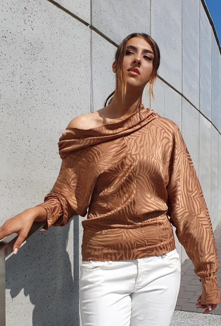 Złota bluzka Federica Tosi. Wytworna, perfekcyjnie uszyta, pomysłowo skrojona, tak aby jedno ramię było odsłonięte. Gdy po założeniu, odsłonimy jedno ramię, wówczas długość rękawów po obu stronach będzie taka sama. Piękna wiskoza w kolorze ciemnego, starego złota z odrobiną dodatku miedzi. Na lewej części dekoltu wszyta gumka, która marszczy tkaninę i utrzymuje odsłonięte ramię. Na prawym boku krótki suwak, która ułatwia włożenie bluzki i jej dopasowanie do bioder. Oba mankiety zapinane na jeden guzik, obciągany tą samą tkaniną co cała bluzka. Całość szyta we Włoszech. Z tyłu, przez środek, biegnie taki sam szew, jak z przodu przez środek. Prać ręcznie.