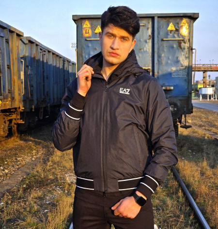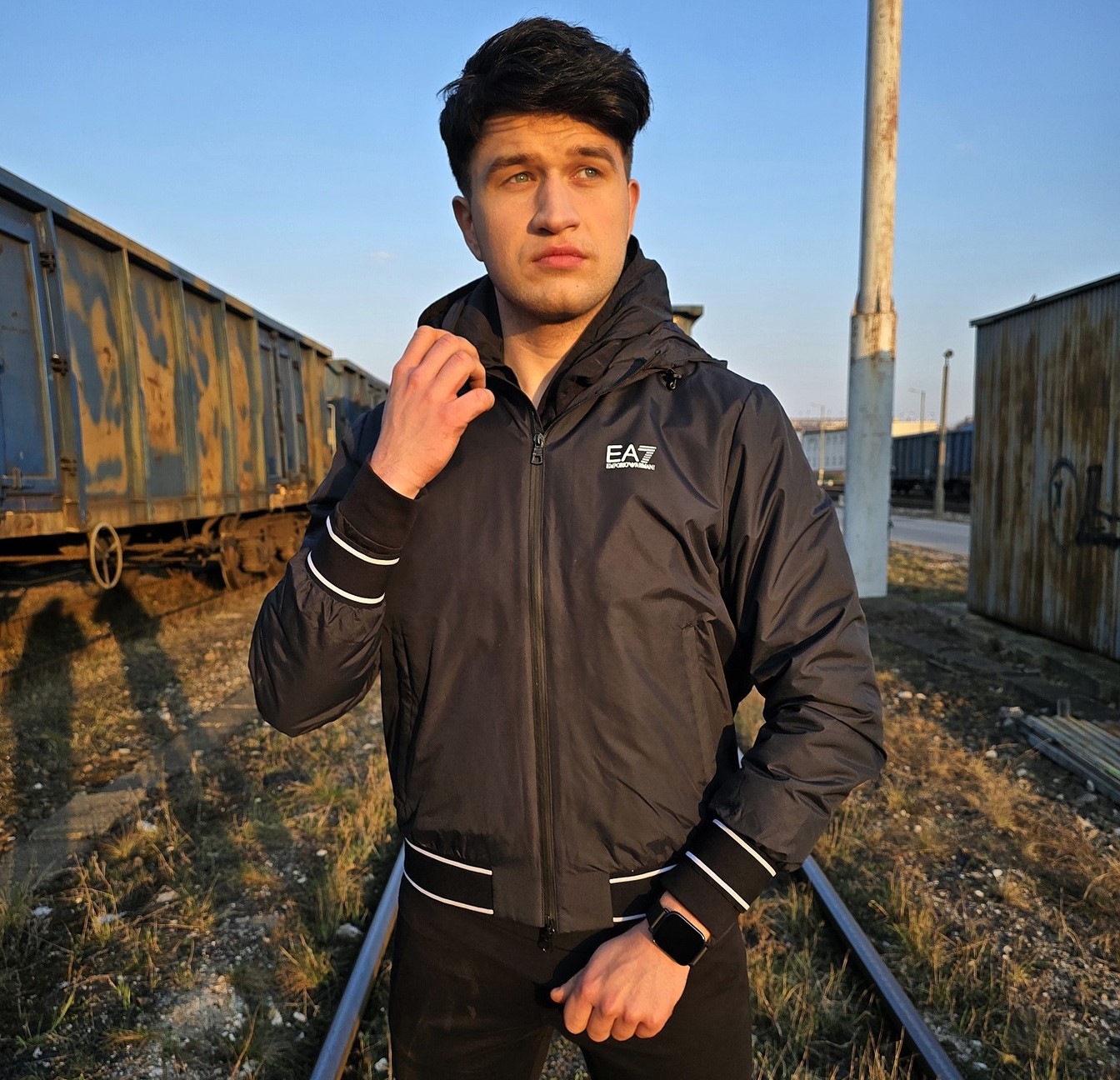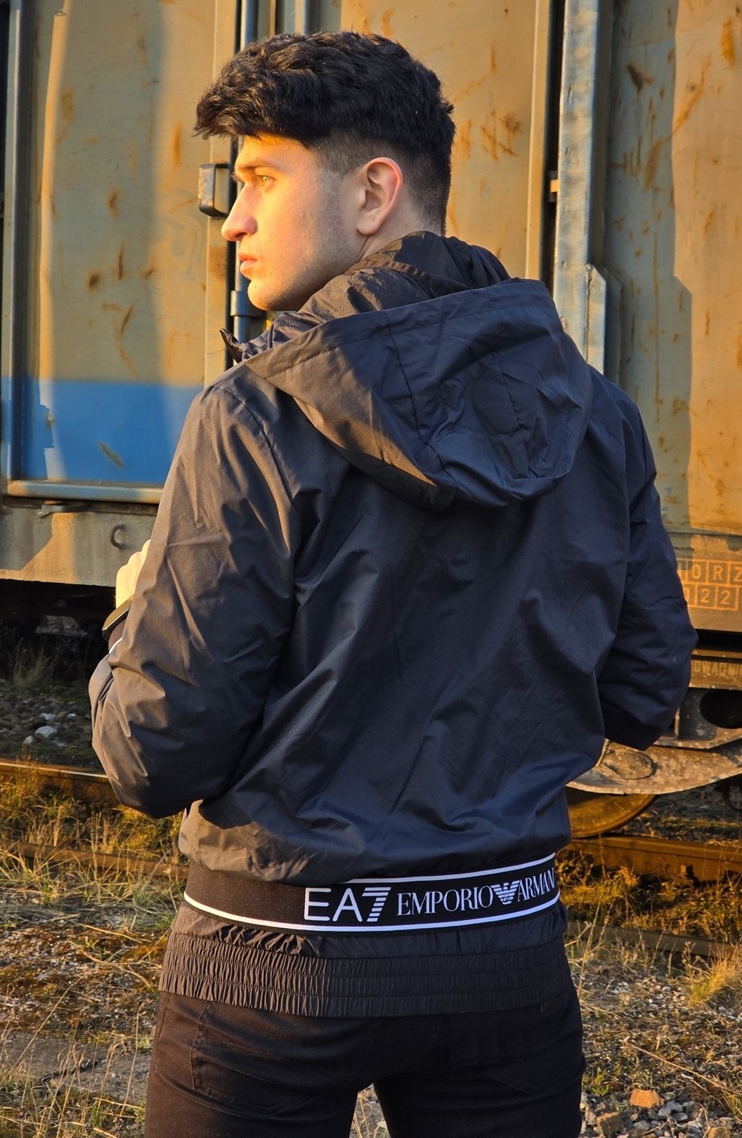 Czarna cienka kurtka bomberka z kapturem Emporio Armani EA7. Składa się z cienkiej warstwy zewnętrznej i wewnętrznej typu polar. Na rękawach i w pasie ściągacz z grubej gumy, z tyłu na ściągaczu logo. Zasuwana. Dwie boczne kieszenie zasuwane. Kaptur można ściągać troczkami. Suwak kryty gumową taśmą, co zabezpiecza przed deszczem. Prać w 30 stopniach