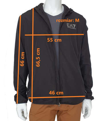 Przeciwdeszczowa, czarna wiatrówka z linii Emporio Armani EA7. Kaptur nie jest chowany w kołnierzu. Dwie zewnętrze zasuwane kieszenie, jedna kieszeń wewnętrzna. Dół kurtki można regulować ściąganą gumką. Od frontu drukowany logotyp farbą fluorescencyjną świecącą w nocy. Z tyłu dekoracyjne paski również drukowane farbą fluorescencyjną. Rozmiary w centymetrach podane na zdjęciu.