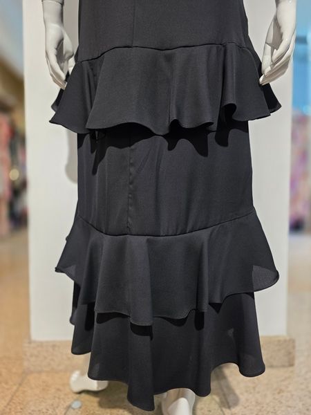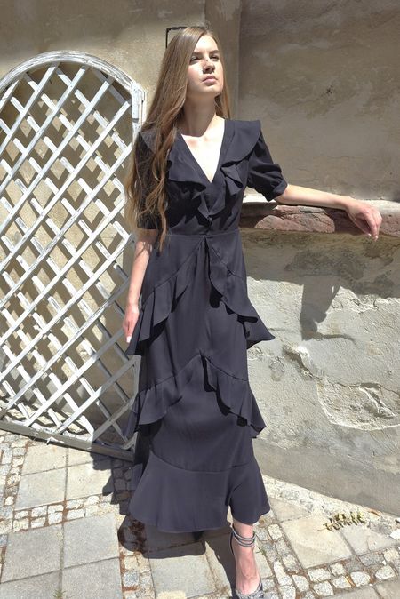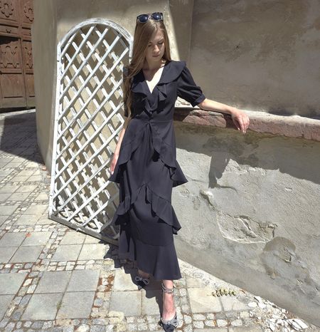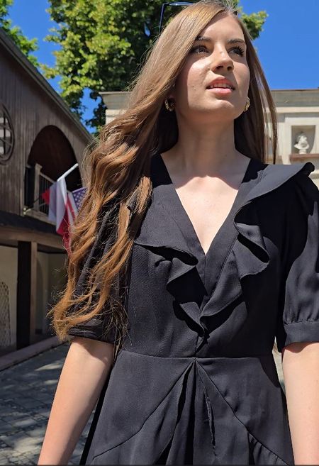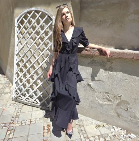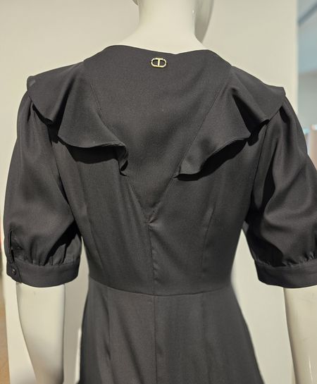 Czarna sukienka Twinset z falbankami i krótkim rękawem. W stylu hiszpańskim. Lekka zwiewna. Doskonale układa się na figurze. Będzie doskonale wyglądać z czerwonymi dodatkami. Odcinana w pasie. Mankiety rękawów zapinane na guziczki. Na plecach delikatne metalowe logo Twinset. Ze względu na falbanki prać ręcznie, nie chlorować.