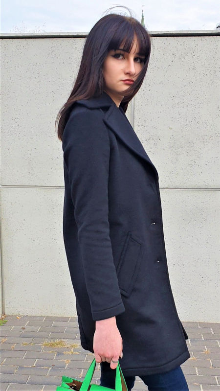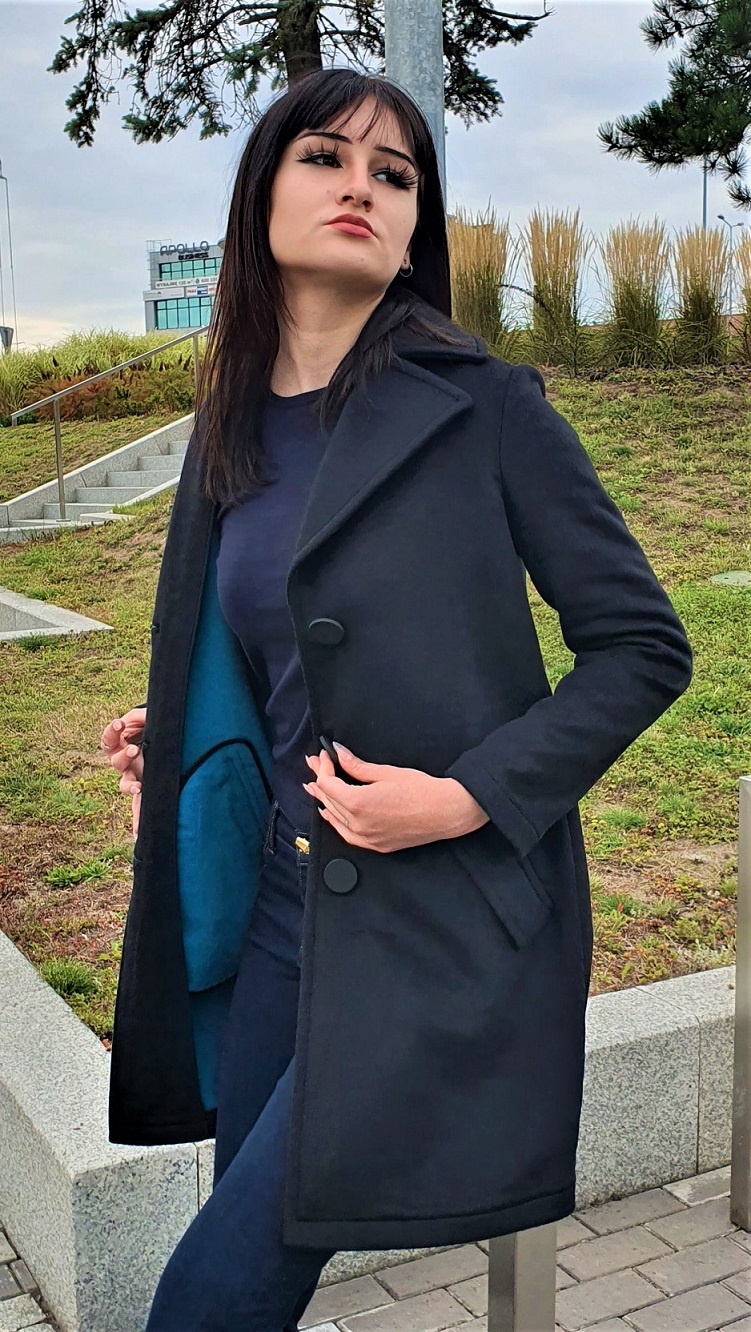 Czarny, damski cienki płaszcz Armani Exchange bez podszewki i bez kaptura. Idealny na dwie pory roku; wiosnę i jesień. Doskonale układa się na sylwetce. Nadaje elegancji, szyku, klasy, a jednocześnie pozwala zachować włoską nonszalancję. Płaszcz nie taliowany, lekko poszerzany do dołu. Od wewnątrz - ciemnoturkusowy, co ma o tyle znaczenie, że stosunkowo długie rękawy można wywijać i wówczas turkusowe mankiety są dodatkowe dekoracje. Zapinany na trzy duże czarne wyraziste guziki. Dwie duże boczne kieszenie. Z tyłu na plecach niewielka stalowa blaszka z wybity logotypem Armani Exchange. Mieszanka wełny i włókien sztucznych gwarantuje płaszczowi trwałość. Taki klasyczny czarny płaszcz, to inwestycja na lata. Klasyczne damskie płaszcze Armani Exchange są zawsze w ofercie naszego outletu tańsze w porównaniu do pierwotnej ceny w butiku.