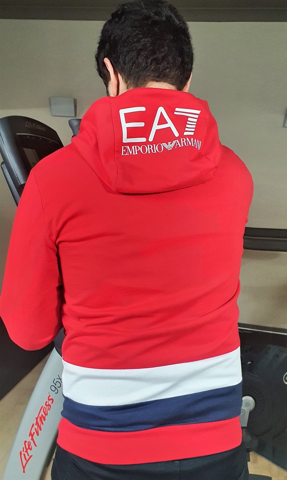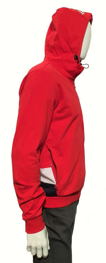 Czerwona bluza z kapturem Emporio Armani EA7. Logotyp z przodu naklejany, biały. Drugi logotyp biały, naklejany na kaptur. 2 boczne zasuwane kieszenie. Na plecach wstawki - pasy z białej i granatowej tkaniny, które sięgają bocznych kieszeni.