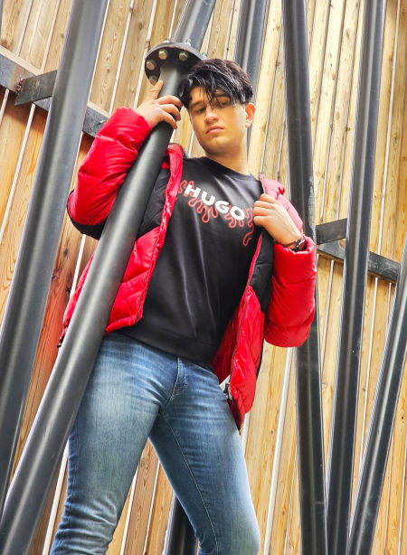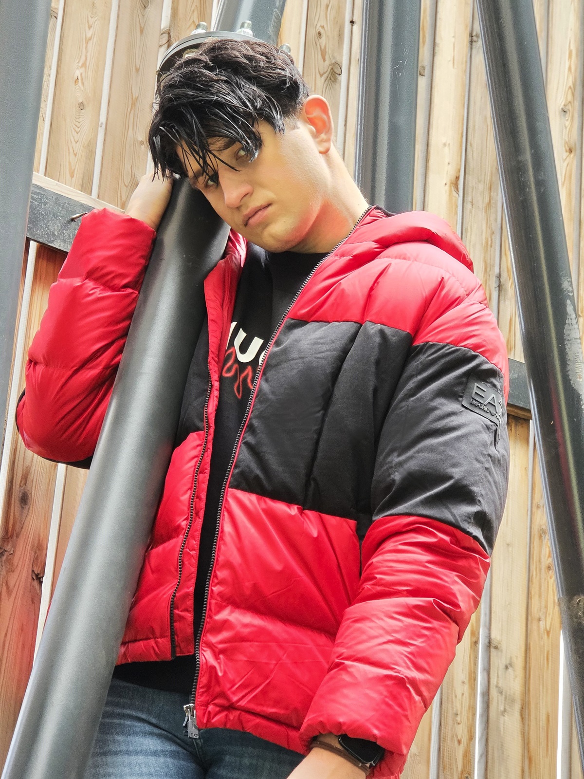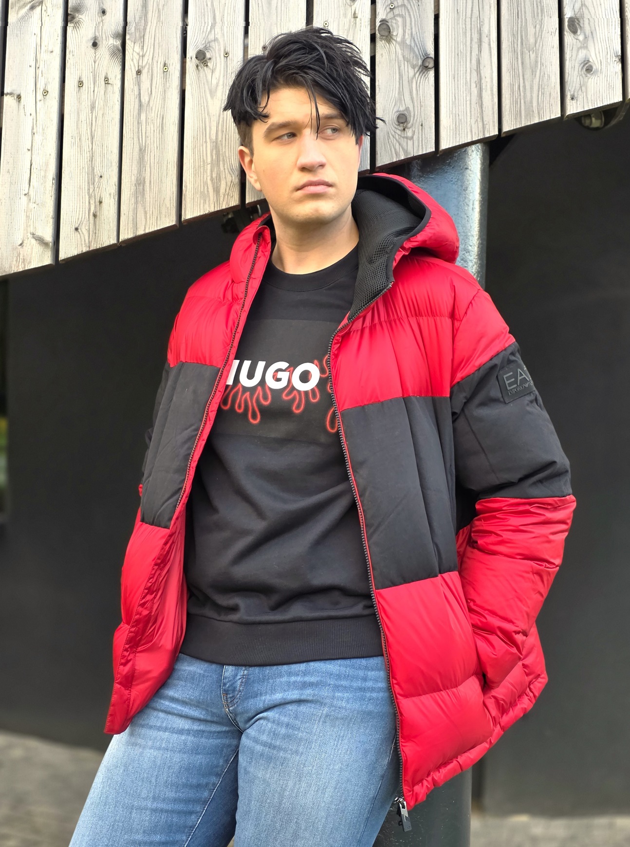 Czerwono - szara, puchowa kurtka Emporio Armani EA7 z kapturem. Na kolorze czerwonym pikowana poziomo, na ciemno-szarym pikowana pionowo. Na lewym ramieniu logo EA7. Dwie boczne zasuwane kieszenie. Czerwona tkanina śliska i lekko błyszcząca. Czarna tkanina matowa. Bardzo ciepły kaptur, od wewnątrz obszyty czarną, siatkową tkaniną. Mankiety wykończone ściągającą lamówką. Kurtka nie ma ściągacza w pasie, ale posiada wszyte gumki na troczkach, którymi można ściągać dół. Model na zdjęciu ma 186 cm wzrostu i założył kurtkę rozmiarze XXL.