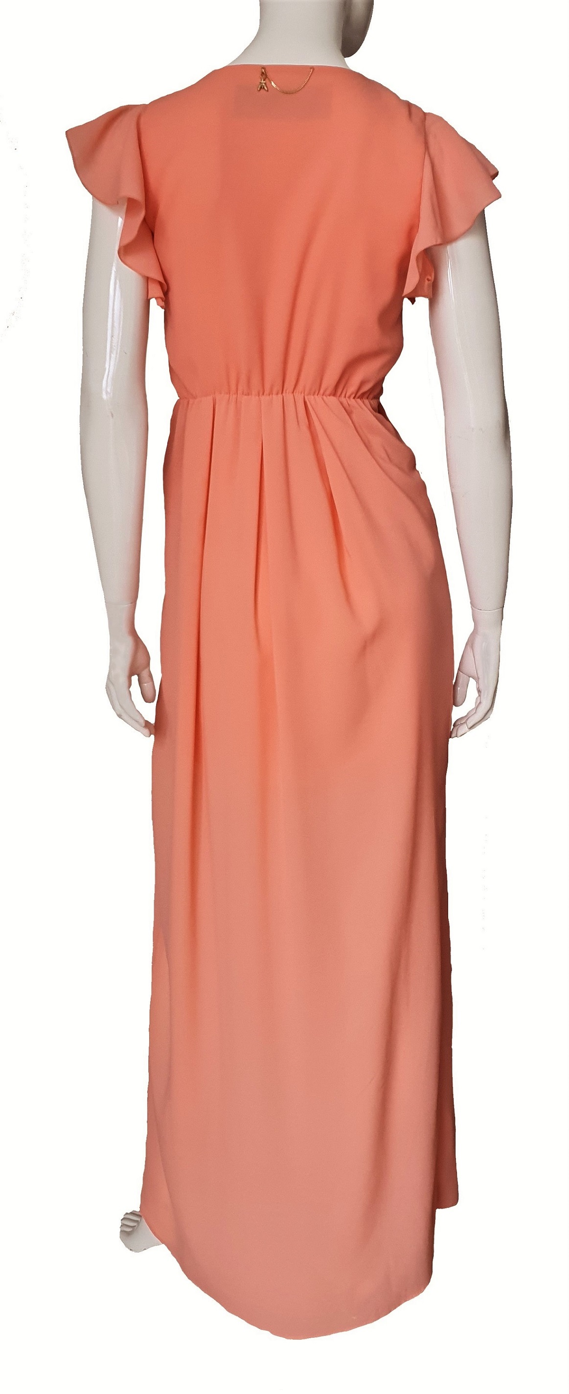 Zjawiskowa, długa, posągowa suknia marki Patrizia Pepe w kolorze brzoskwiniowym. Idealna na specjalną uroczystość. Wygodna gumka pasie Cudownie układa się na figurze. Z przodu rozcięcie. Bez podszewki.