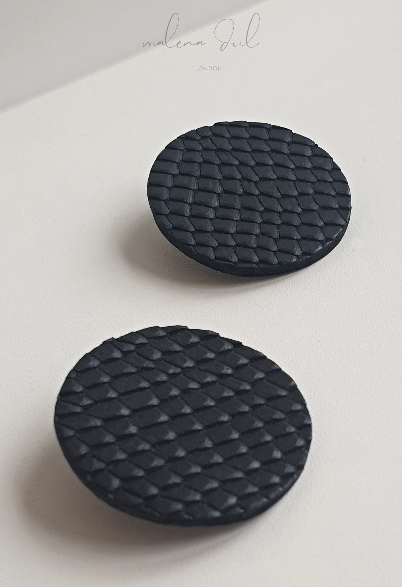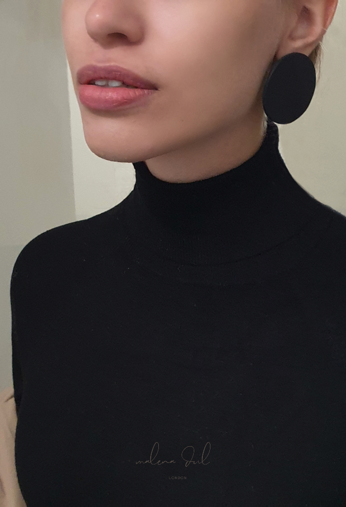 Kolekcja SUN. Spektakularne, duże, geometryczne kolczyki, wykonane z naturalnej, czarnej skóry o fakturze skóy węża. Klasyczne i bardzo eleganckie. Swoją formą przywodzą w pamięci odważne lata 80te. Pięknie komponują się z prostymi w formie stylizacjami. Sprawdzą się jako niebanalny dodatek to sukienki, marynarki, golfu czy prostego t-shirtu i jeansow. Wygodne i lekkie. Kolczyki występują w kilku kolorach/wzorach.