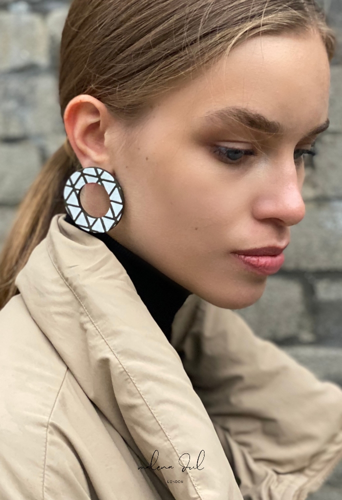 Kolekcja ROTA, to spektakularne, duże, proste w formie kolczyki i bransoletki autorstwa Maleny Dul. Wykonane z białej lakierowanej skóry we wzór geometryczny.