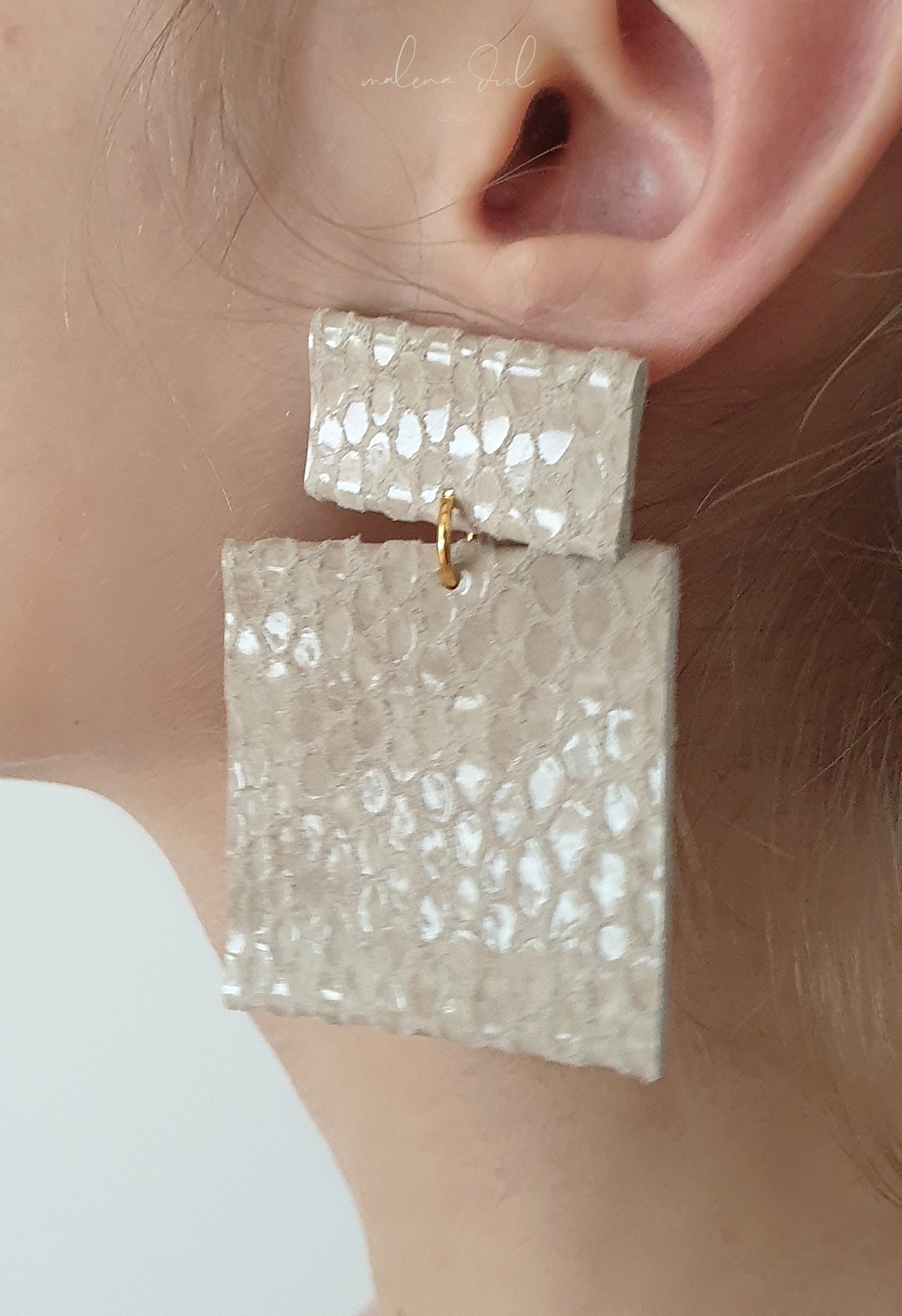 Kolekcja RAW, to spektakularne, dużych rozmiarów kolczyki i bransoletki w ponadczasowe animalistyczne motywy.Wykonane z jasnej, beżowej, lakierowanej skóry, tłoczonej we wzór skóry węża.Eklektyczne, niebanalne w formie. Łączą w sobie sprzeczności jak surowość z elegancja, prostotę z zaskaującą formą. Pięknie komponują się z prostymi w formie stylizacjami, koszulą, garniturem, golfem, prostą długą suknią czy małą czarną. Wygodne, nie obciążają ucha. Kolczyki występują w kilku kolorach/wzorach jak zebra, krokodyl czy wąż.