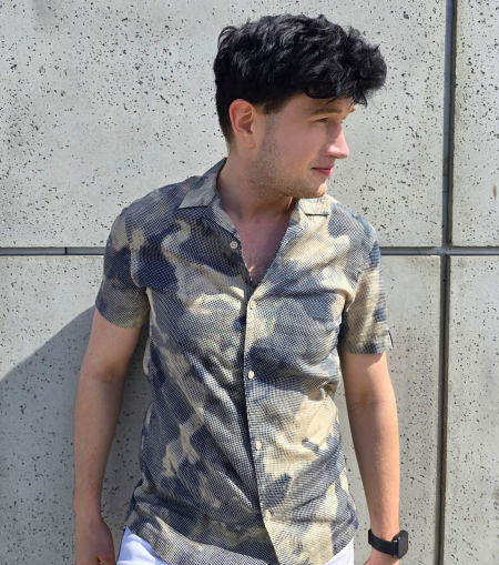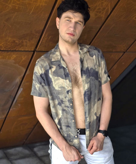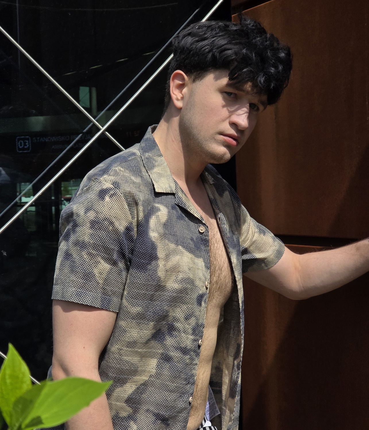 Koszula z krótki rękawem Armani Exchange. Kołnierzyk marynarkowy, bardzo przewiewna tkanina, ciekawie tkana i drukowana. Cienka, ale nie prześwitująca. Z boku na szwie na dole czarna wszywka z logotypem Armani Exchange. Na prawym ramieniu druga, czarna naszywka z logotypem AX. Lekko taliowana. Prosty krój, miękki kołnierzyk.