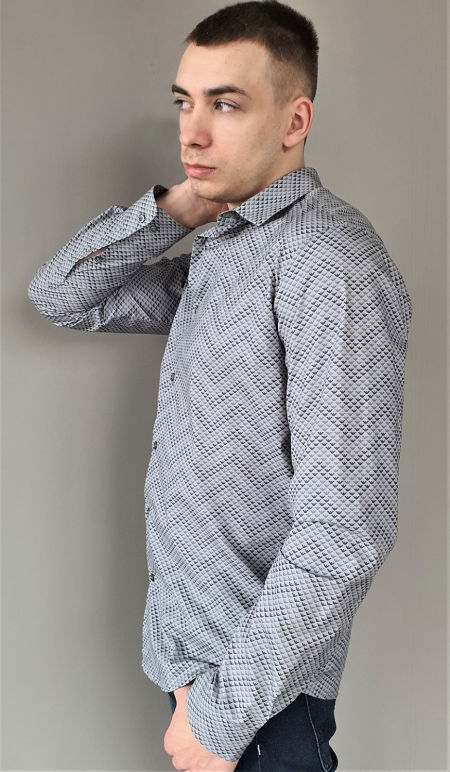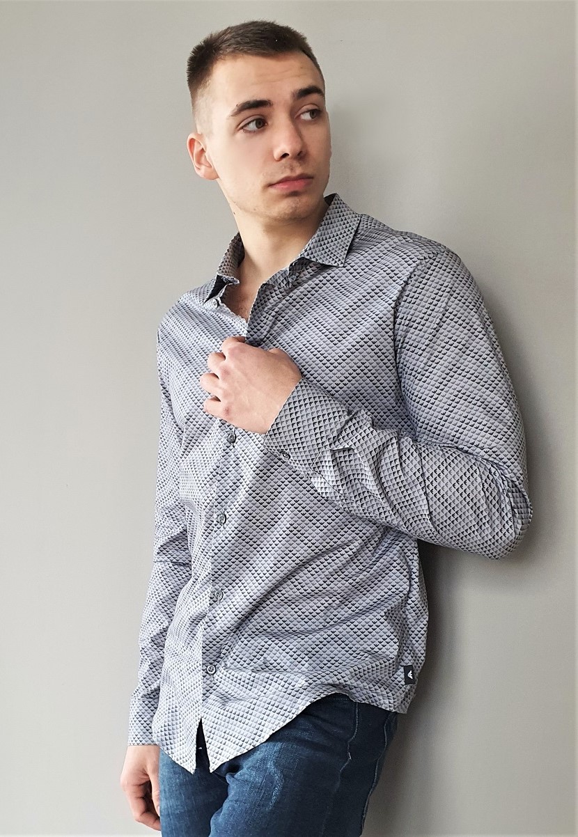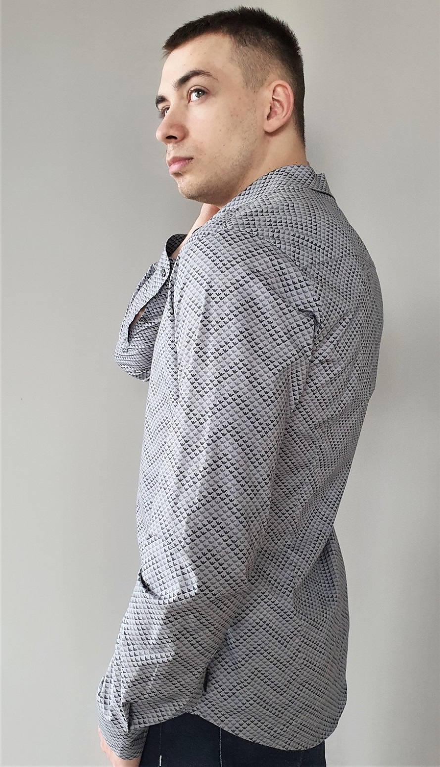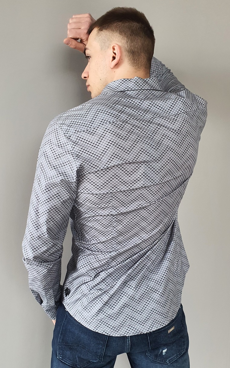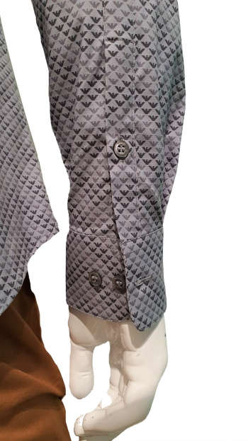 Męska elegancka szara koszula Emporio Armani dla wielbicieli tej linii domu mody Armani. Dekorowana wzorem z drukowanych orzełków Emporio Armani. Przewiewna, cienka, ale gęsto tkana bawełna. Idealna zarówno do wpuszczania w spodnie, jak i noszenia luźno na wierzch.
