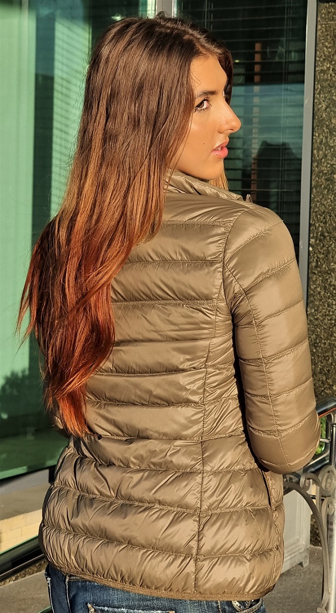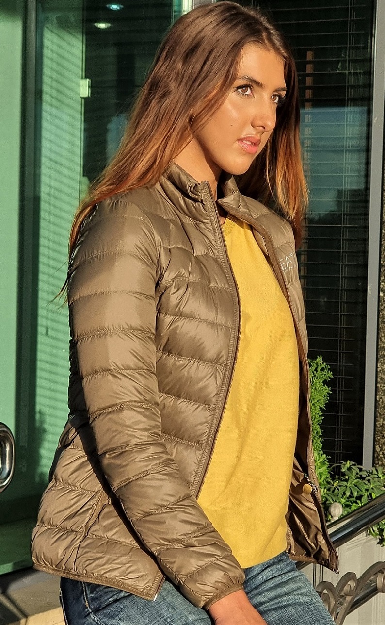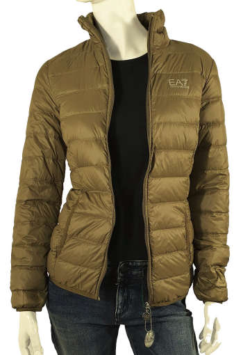 Lekka sportowa damska kurtka z linii EA7 Emporio Armani w oliwkowym kolorze. Klasyczna, pikowana wiosenna puchówka. Srebrne logo EA7 z przodu. Dwie zewnętrzne boczne kieszenie, dwie kieszenie wewnętrzne.