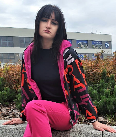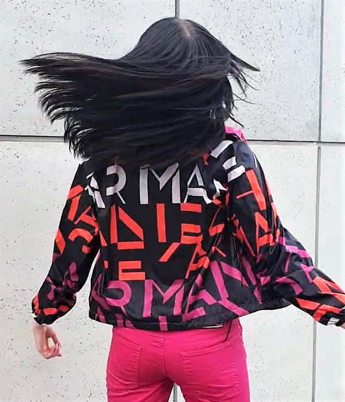 Dwustronna damska kurtka przeciwdeszczowa Armani Exchange z chowanym kapturem. Z jednej strony czarna, dekorowana kolorowymi literami, układającymi się w napisy Armani Exchange, z drugiej strony w kolorze fuksji. Idealna na deszcz, zawadiacka, dwie boczne kieszenie, rękaw typu raglan, stąd długość rękawa podana w wymiarach jest tylko orientacyjna.