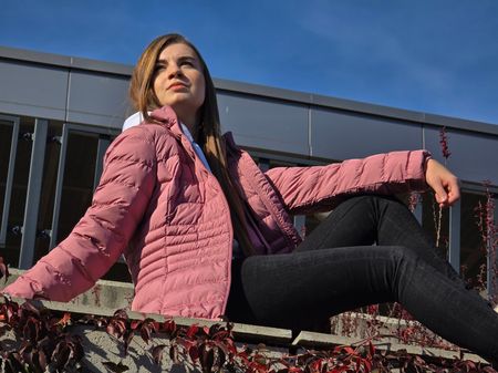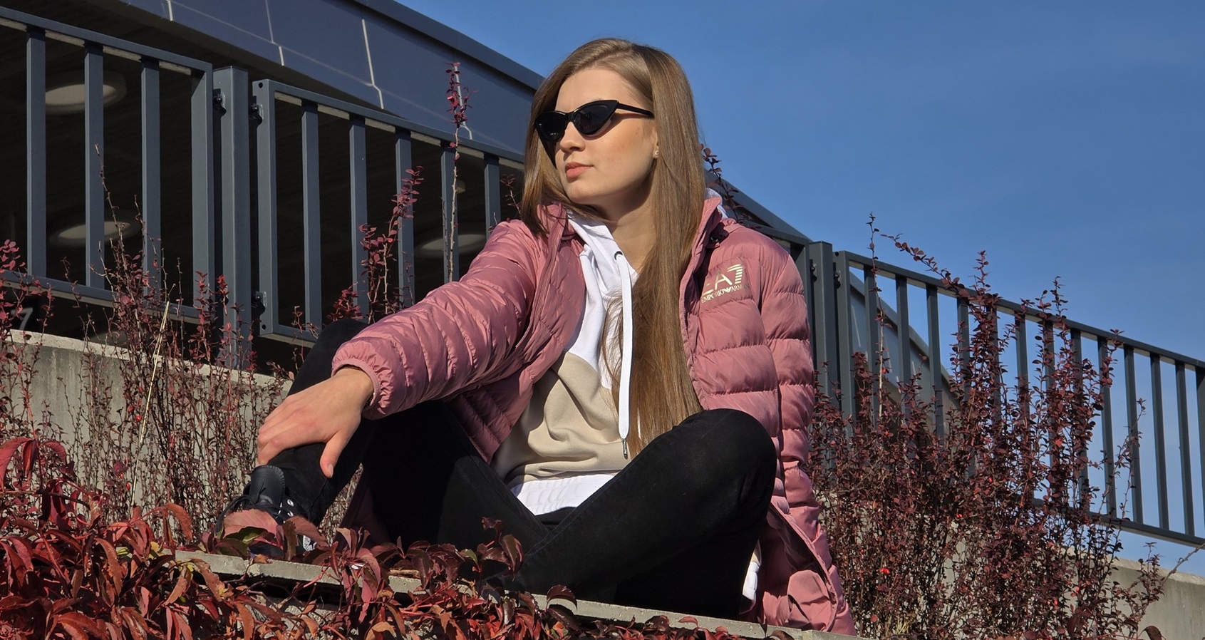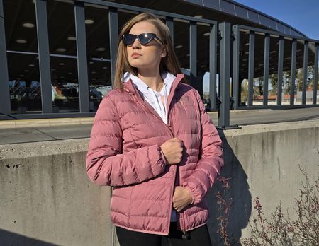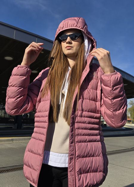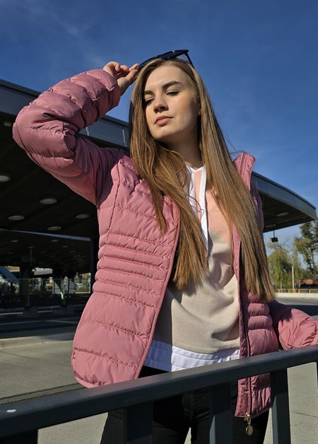 Cienka kurtka Emporio Armani EA7 z kapturem w kolorze brudny róż. Kaptur można oddzielić, bo jest na suwak. Od frontu srebrne drukowane logo EA7, boczne kieszenie zewnętrzne, obie zasuwane. Kurtka bardzo lekko taliowana. Suwaki również kolorze brudnego różu. Uchwyt suwaka w kolorze złota z logotypem EA7. Kaptur mankiety i dół wykończone elastyczną lamówką, która uszczelnia ubrania i chroni przed wiatrem. Materiał wierzchni matowy. Prać w pralce w 30 stopniach
