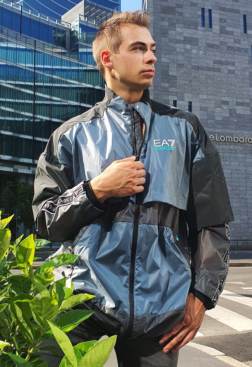 Kurtka przeciwdeszczowa bez kaptura Emporio Armani EA7 ze specjalistycznej linii Ventus. Bardzo ciekawy fason, kurtka uszyta z wielu kawałków różnych materiałów. Zasuwana. W mankietach ściągacze. Dół lekko rozszerzany bez ściągacza, obszyty czarną, elastyczną lamówką. Na plecach dodatkowa warstwa peleryny. Na froncie logo EA7. Dwie boczne zasuwane kieszenie. Bardzo ciekawe rękawy, obszyte szeroką czarną taśmą z logotypami EA7, dwuwarstwowe. Wierzchnia warstwa rękawa jest dużo krótsza i kończy się nad łokciem niczym rękaw t-shirta. Dół z przodu wykończony lekkim zaokrągleniem. Do wykonania kurtki użyto kilku różnych nieprzemakalnych materiałów. w tym poliamid, poliuretan, poliester, elastan. Prać ręcznie. Tę kurtkę nasz Luxury Outlet Grand oferuje zarówno w sklepie stacjonarnym w Kielcach jak i on-line.