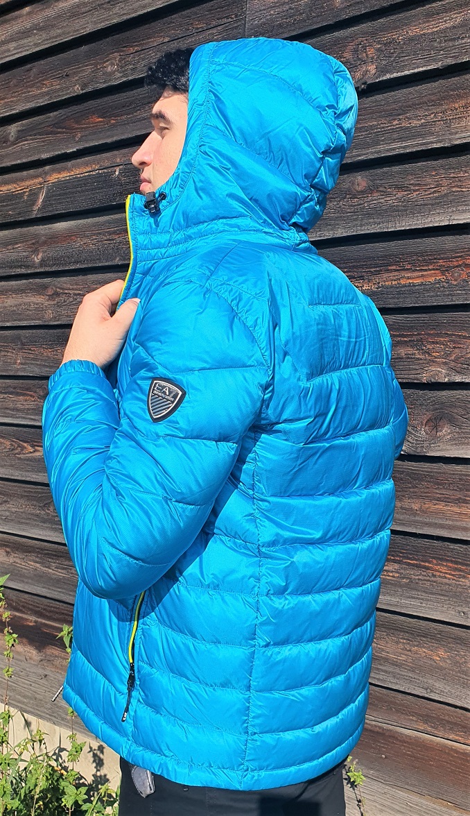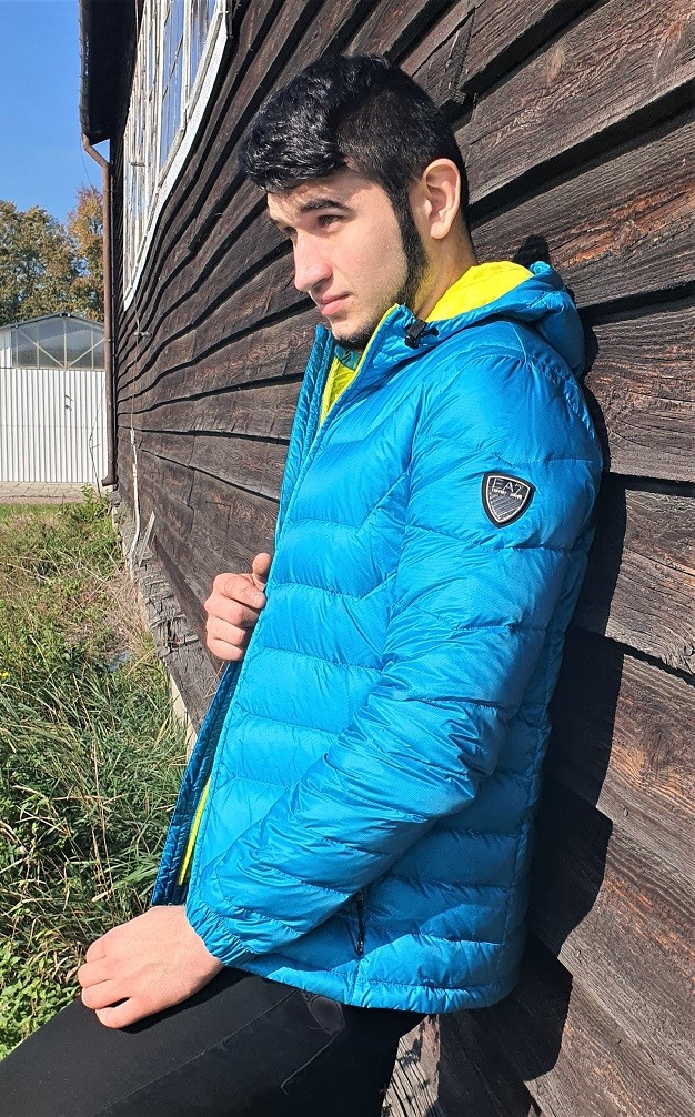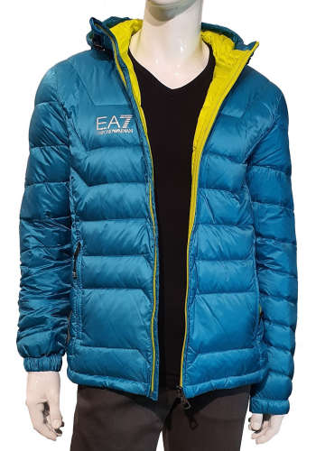 Puchowa, zimowa kurtka Emporio Armani EA7 w kolorze turkusowo- morskim. Podszewka w kolorze limonki. Z nieodpinanym kapturem. Dwie kieszenie zasuwane boczne. Dwie wewnętrzne. Kaptur oraz pas można ściągać troczkami, żeby dodatkowo zabezpieczyć przed wiatrem. Wzór na froncie drukowany w kolorze srebrnym metalicznym. Na ramieniu tarcza z logotypem EA7. UWAGA, ze względu na specyficzną rozmiarówkę linii EA7, radzimy wybierać ubrania o rozmiar większe niż innych marek, czyli nosząc M, innych marek radzimy wybrać L od Emporio Armani EA7.