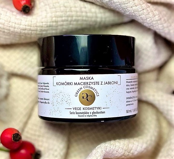 Maska Komórki Macierzyste - to maseczka oczyszczająca, zawierająca w swym składzie glaukonit - minerał z Lubelszczyzny oraz kaolin. Ta maska jest przeznaczona do pielęgnacji każdego rodzaju skóry. Zawiera nawilżający składnik, jakim jest betaina, ale też ekstrakty roślinne, a wśród nich ekstrakt z chabra bławatka, ekstrakt z bzu czarnego, ekstrakt z maliny oraz naturalny olej migdałowy. Maska z linii wege kosmetyków została wzbogacona o komórki macierzyste z liści jabłoni o działaniu kojącym, łagodzącym zaczerwienienia i nadającym promienny wygląd skóry. Warto wiedzieć, że komórka macierzysta jabłoni działa na dwóch poziomach układu zapalnego: jest jednym z mediatorów stanu zapalnego, odpowiedzialnym za podrażnienia, i drugim odpowiedzialnym za zaczerwienienia. Aktywne komórki macierzyste jabłoni ograniczają uwalnianie substancji zapalnych.
