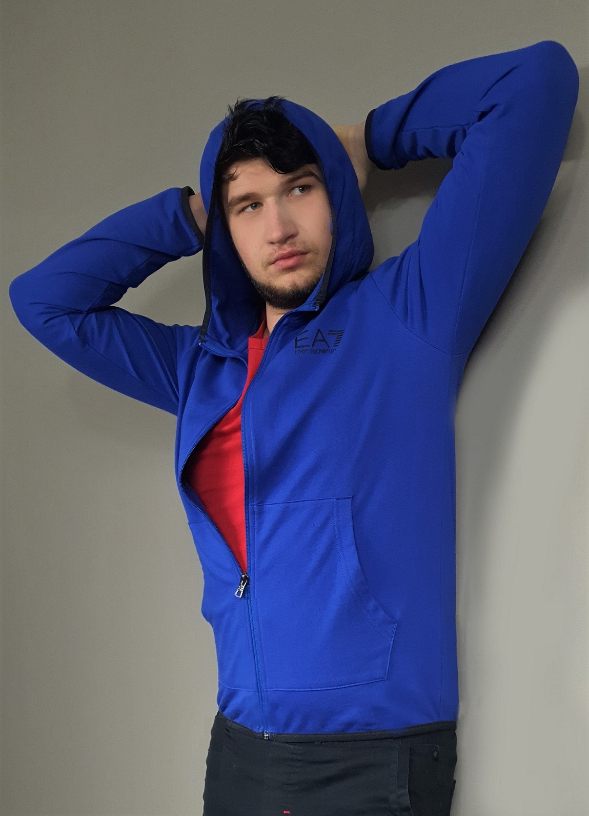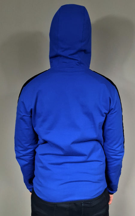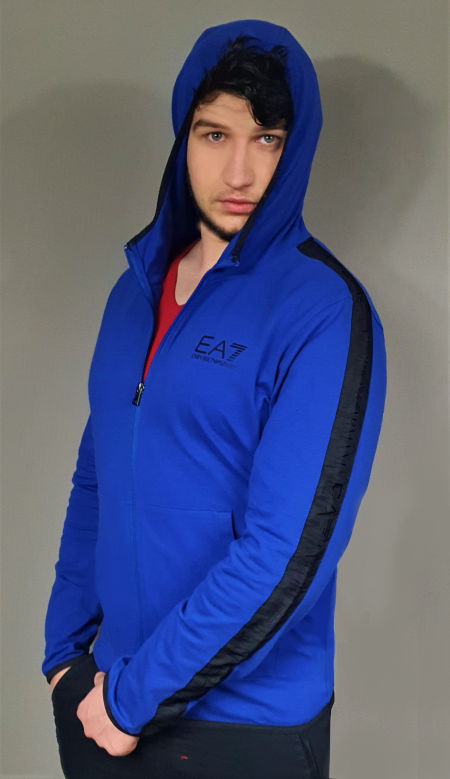 Szafirowa męska bluza Emporio Armani EA7 z kapturem, zasuwana. Dwie zewnętrzne naszywane kieszenie z przodu. Obszywana czarną lamówką kieszenie, z tyłu gładka. Czarny logotyp z przodu. Na rękawach naszyte czarne ozdobne taśmy logowane powtarzalnym napisem "EA7 Emporio Armani".