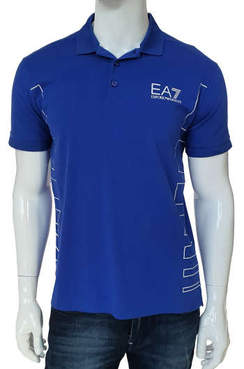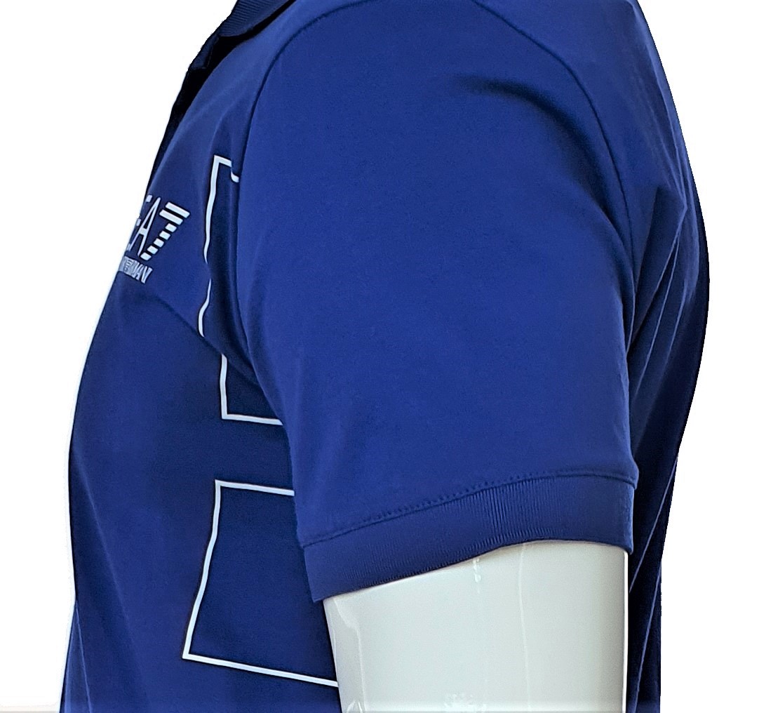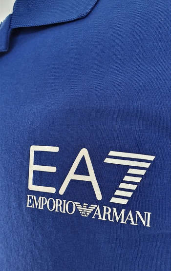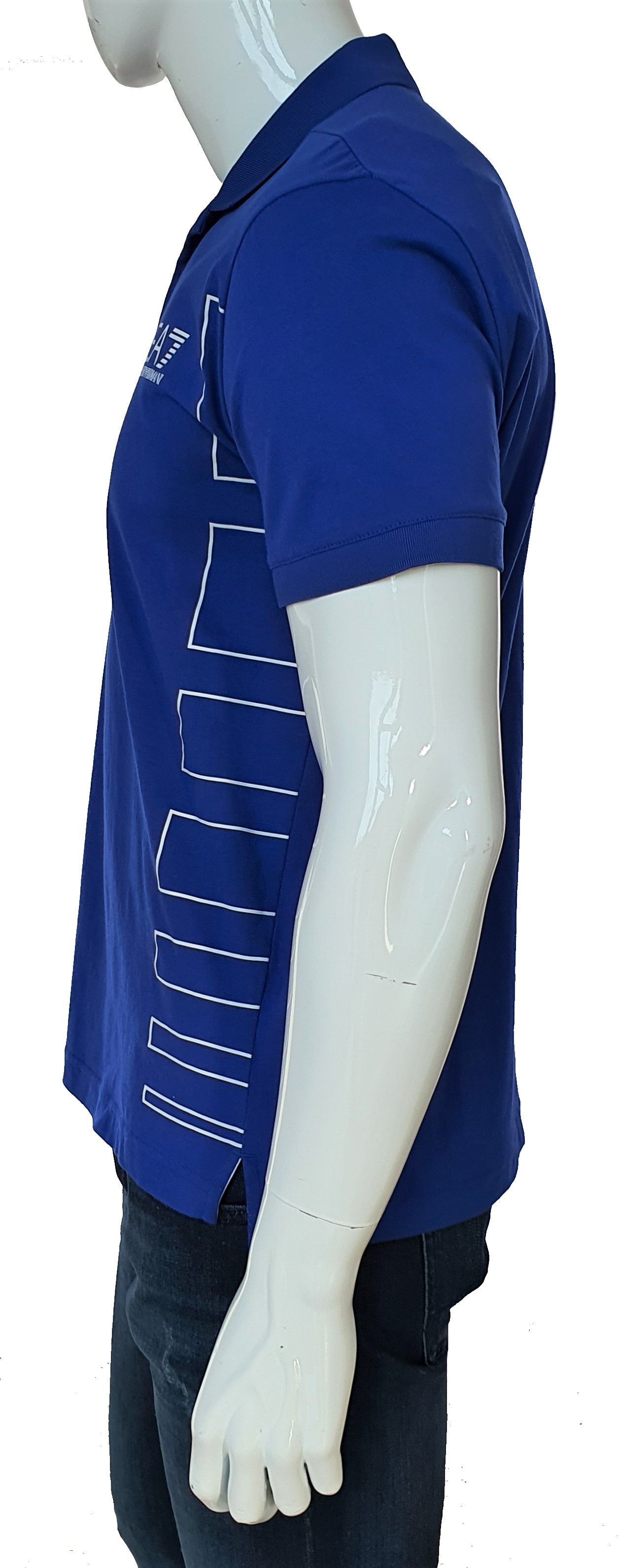 Szafirowe męskie polo Emporio Armani EA7, Ściągacze na rękawach. Białe dekoracyjne drukowane wzory od frontu. Drukowane białe logo od frontu. Z tyłu gładkie. Tkanina bawełniana taka, jak w t-shirtach. Będzie dobrze wyglądać z błękitnymi lub białymi jeansami. Uwaga ze względu na specyficzną rozmiarówkę linii EA Armaniego radzimy wybierać modele o rozmiar większe niż na metce. Jeżeli na przykład ktoś nosi standardowe L w innych markach, radzimy wybierać model XL.