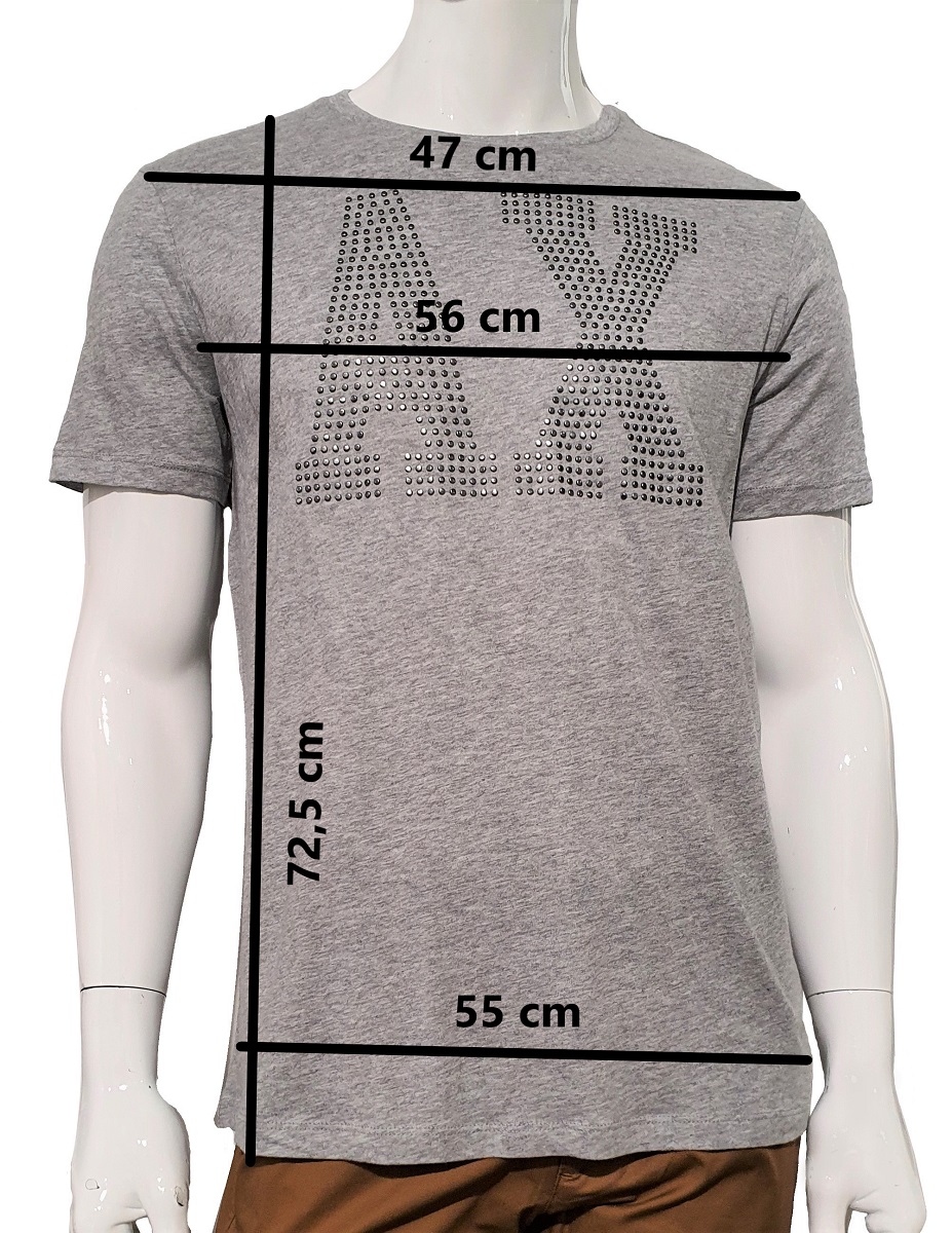 Wygodny i nieco ekstrawagancki t-shirt z linii Armani Exchange. Duży, dynamiczny logotyp z naklejonych lekkich ćwieków w kolorze szarej, połyskliwej stali. Bardzo miękka, lejąca bawełna w kolorze jasnoszarym. Z tyłu na karku naklejony niewielki logotyp Armani Exchange z gumowych wypukłych liter.