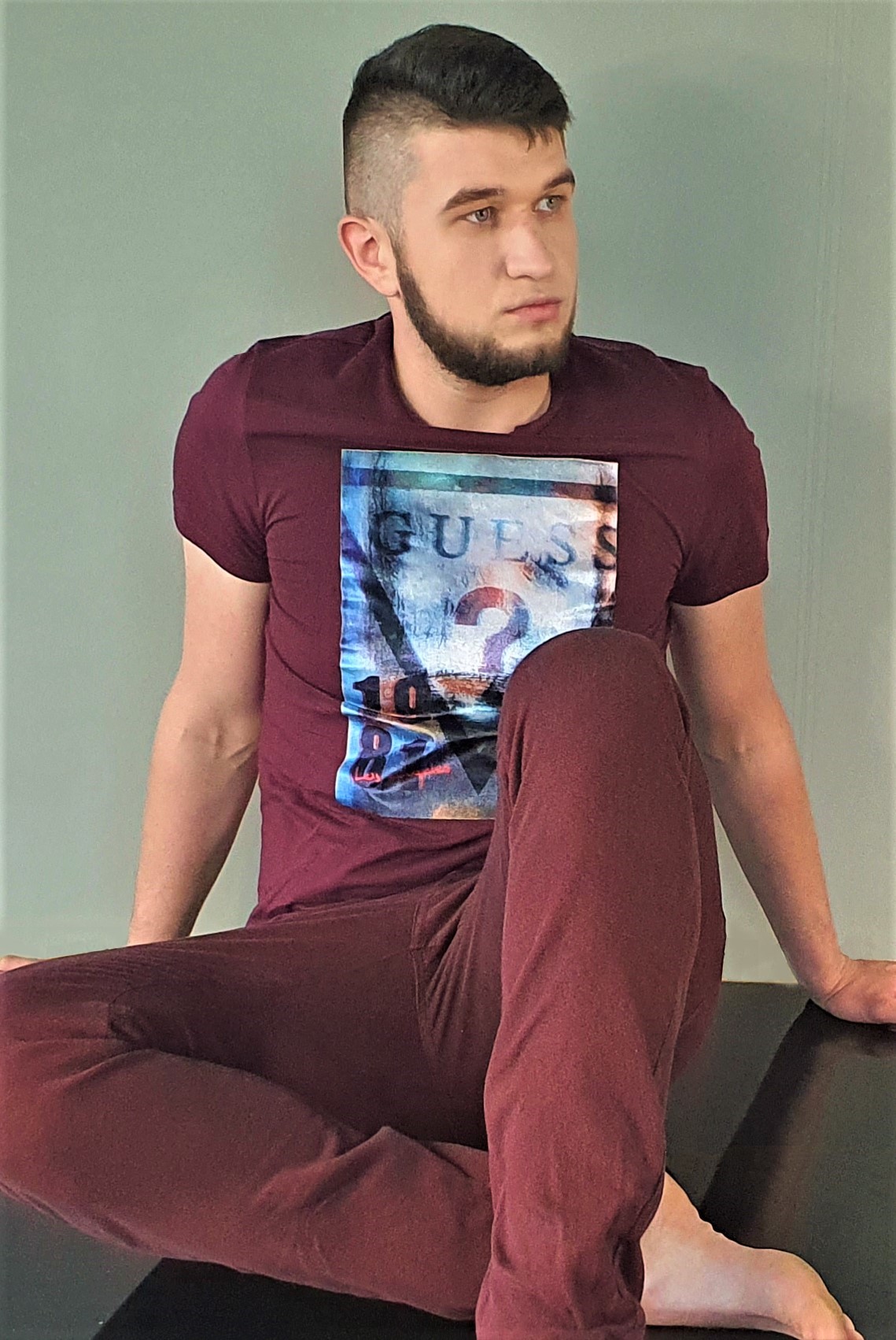 T-shirt Guess w kolorze pomiędzy bordowym a ciepłym brązem. Wzór ze stylizowanym logotypem Guess trójwymiarowy, naklejany na front.