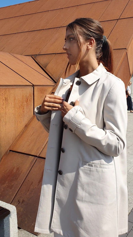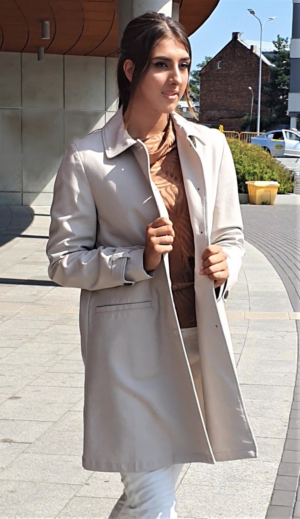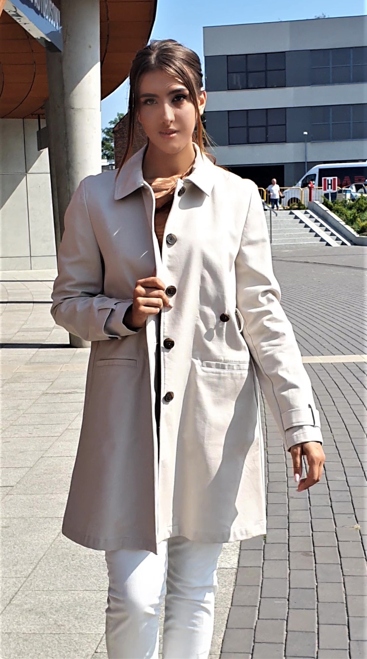 Cienki płaszcz Stefanel w kolorze ecru. Z nieco grubszej i sprężystej tkaniny, ale bez podszewki. Mały kołnierz. Płaszcz zapinany z paskiem z tyłu, dopinanym guzikami. Z przodu dwie głębokie kieszenie. Na mankietach dwie ozdobne patki. Z tyłu lekkie rozcięcie. Płaszcz nie taliowany, w delikatnym kroju litery A. Prać chemicznie.