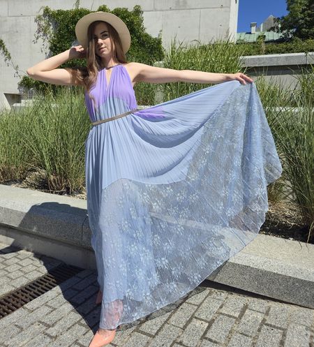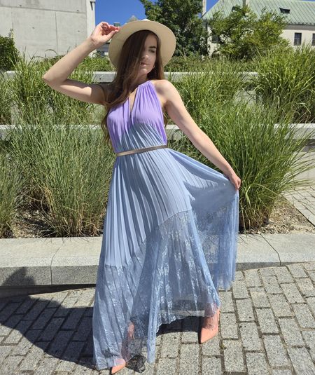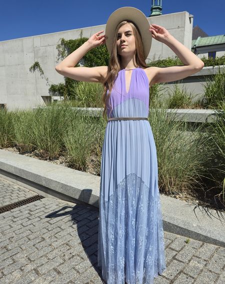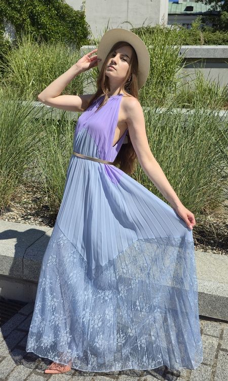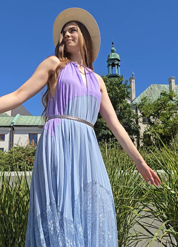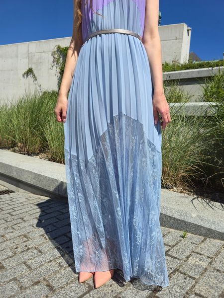 Piękna sukienka marki Twinset w kolorach błękitu i wrzosu. Przy szyki sznureczek, z tyłu na szyi zapinana na jeden guzik. Częściowo od góry plisowana. U dołu charakterystyczna dla tej marki koronka. Na podszewce. Szeroko kloszowana. Na zdjęciu sfotografowana z paskiem, ale został on użyty tylko do przykładowej stylizacji. Sukienka swojego paska nie posiada. Sukienka pasuje na rozmiar od 38 do 40. Dobra na większy biust. Ze względu na koronkę prać ręcznie.