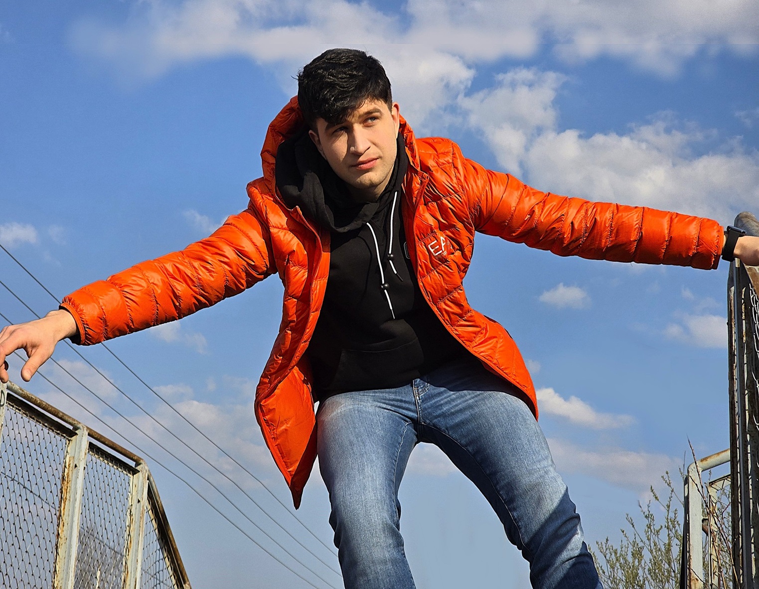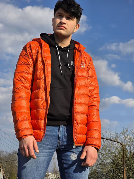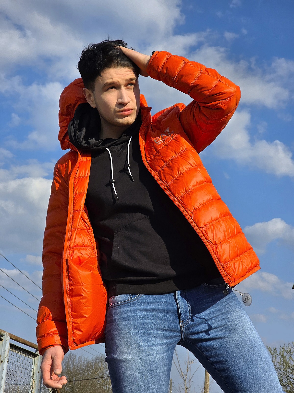 Pomarańczowa lekka kurtka puchowa Emporio Armani EA7 z kapturem. Klasyczna cienka przejściowa kurtka w energetycznym pomarańczowym kolorze. Od frontu dwie kieszenie. Na przodzie drukowane srebrzyste logo EA7. Zasuwana. Na mankietach i pasie obszyta elastyczną lamówką.