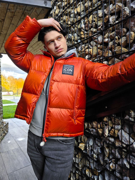 Lekka, męska puchówka Armani Exchange, w kolorze pomiędzy pomarańczem a miedzią. Materiał z połyskiem Będzie dobrze prezentować się w jesiennym i zimowym słońcu. Świetnie wygląda w połączeniu z jasnym jeansami. Bez kaptura. Od frontu dwie zasuwane kieszenie. Na froncie logo Armani Exchange Icon. Na dole ściągana gumowymi troczkami, które można regulować. Mankiety rękawów z elastycznymi swetrowymi ściągaczami. Podwójny suwak pozwala lekko rozsuwać kurtkę od dołu. Model na zdjęciu ma 186 cm wzrostu i założył rozmiar XXL, która jest na niego za duża.