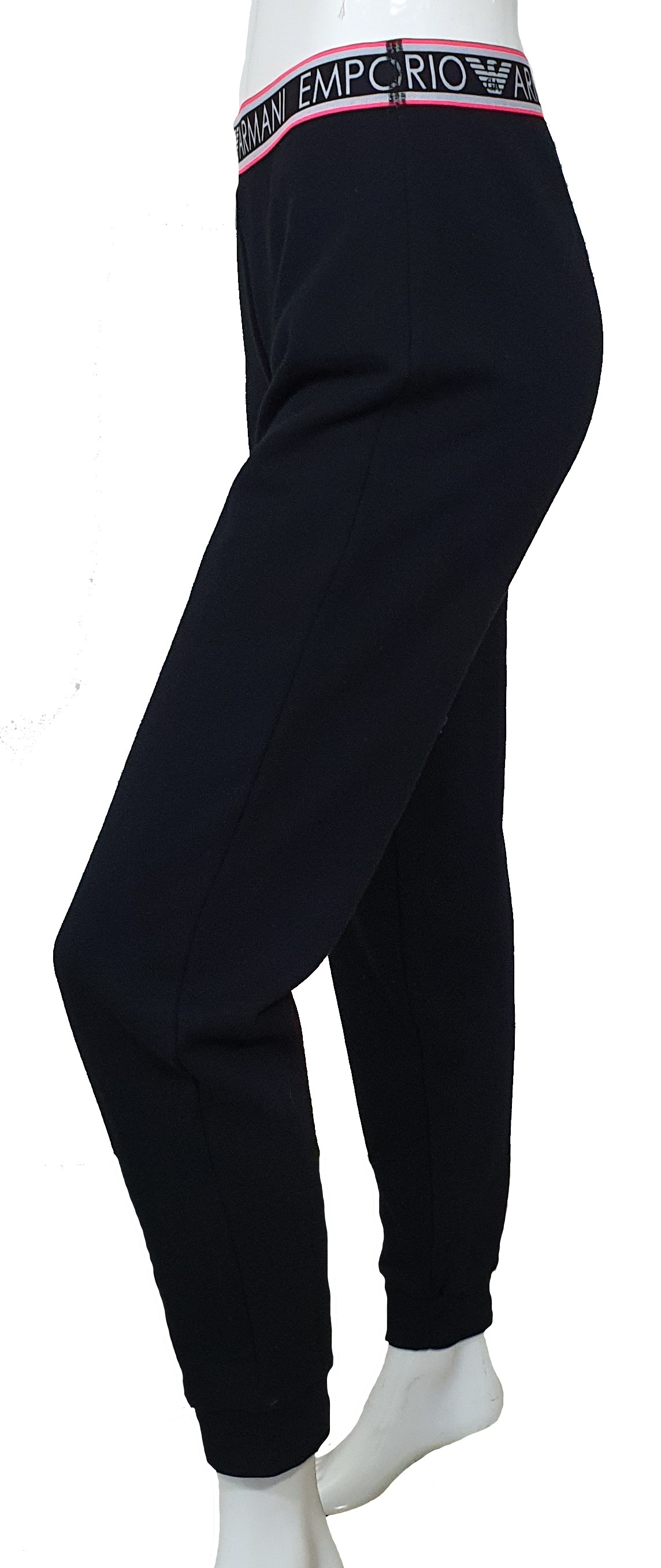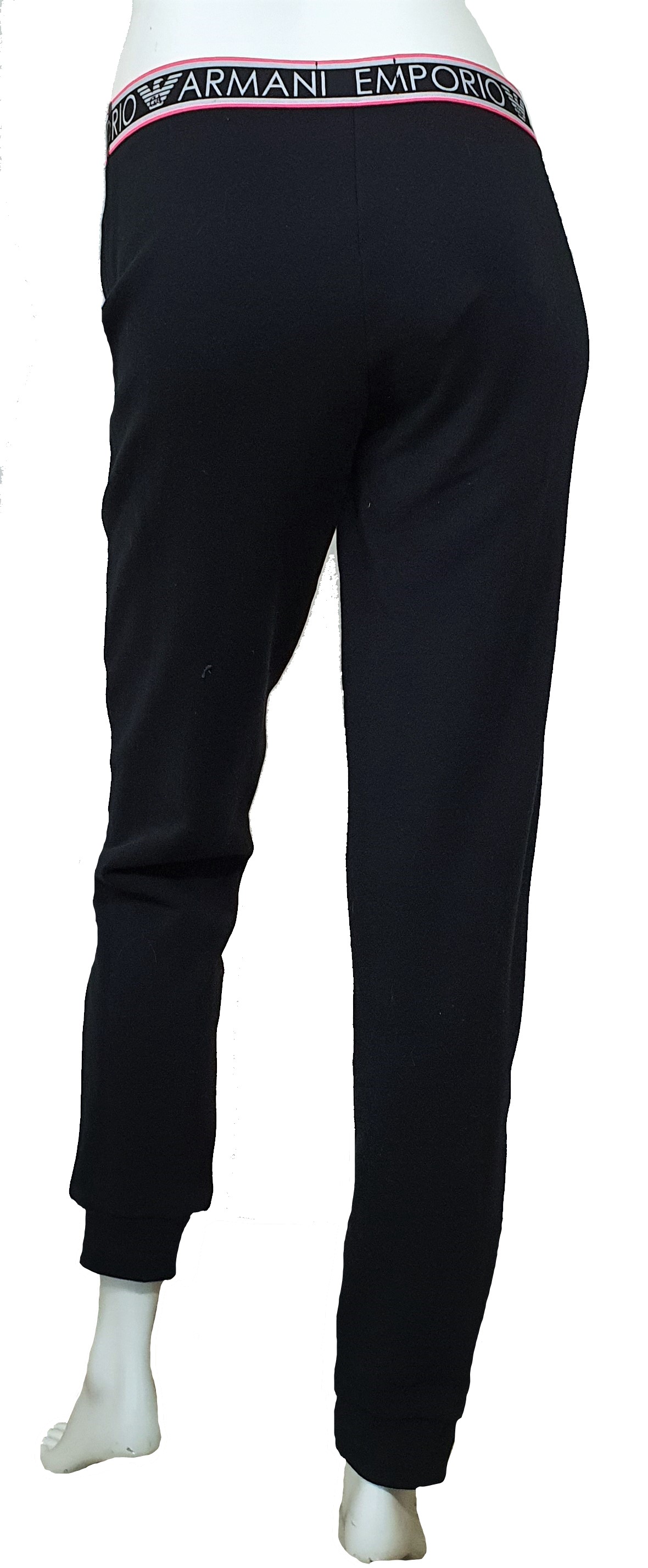 Spodnie damskie dresowe, czarne, wygodne z linii Emporio Armani Underwear. Nieco grubiej, ale delikatnie rzadziej dziana dzianina. Nie jest tak zbita jak klasyczna tkanina na dresy. Wygodna guma w pasie. Brak kieszeni.