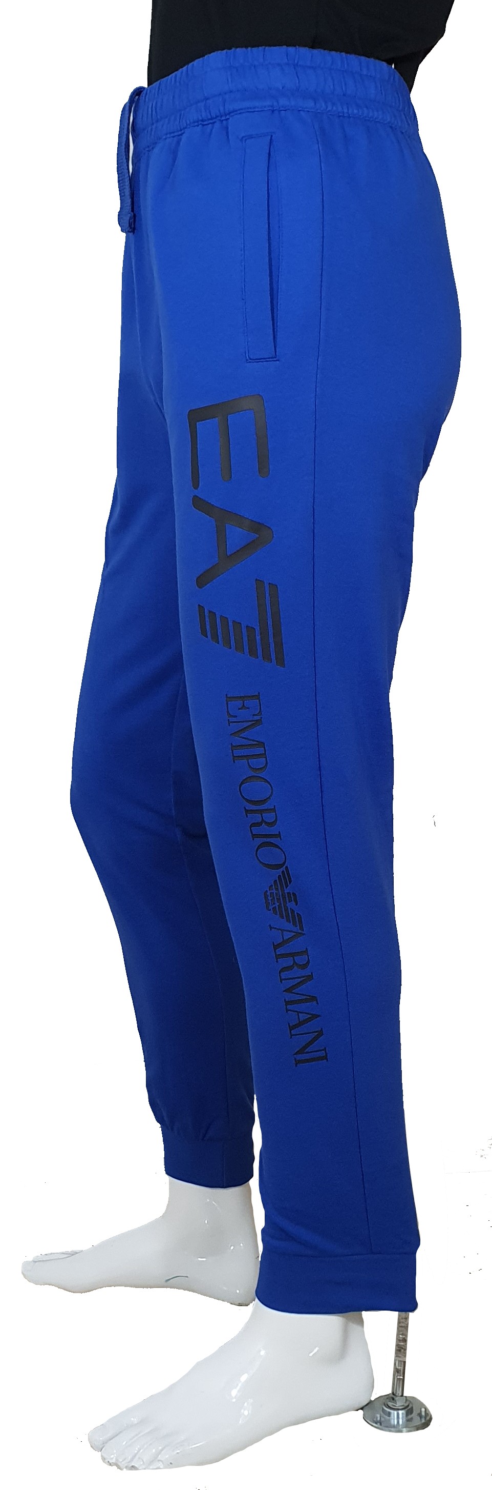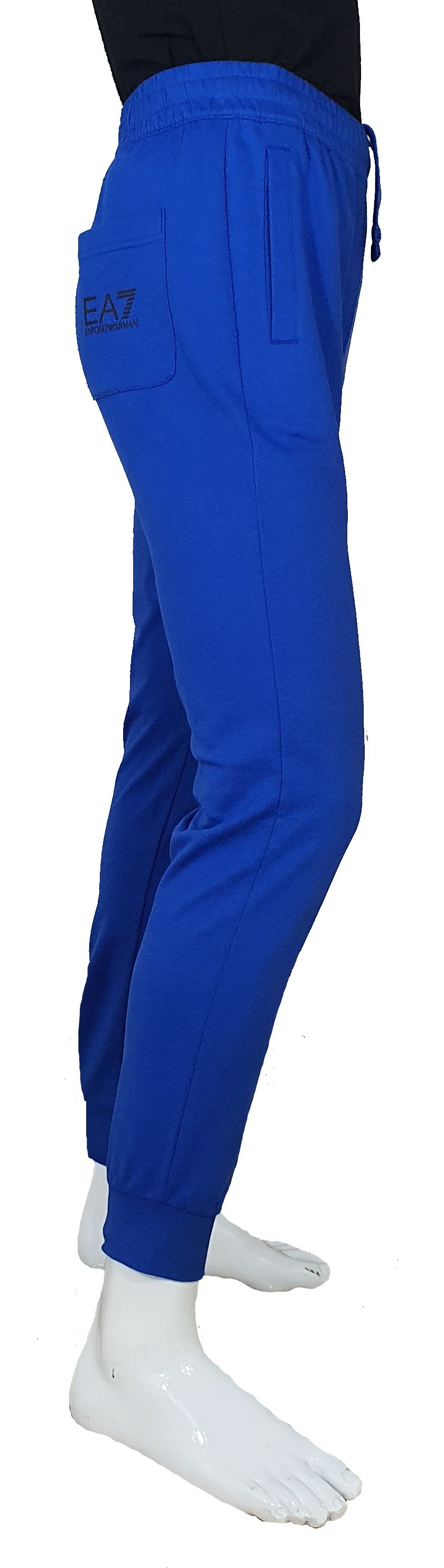 męskie spodnie dresowe Emporio Armani EA7 w kolorze szafirowym o klasycznej grubości materiału. Wygodne, a pasie szeroka guma oraz troczki do wiązania. Ze ściągaczem w nogawkach, Dwie boczne kieszenie, jedna z tyłu naszywana. Z tyłu mały czarny naklejany logotyp, od frontu na jednej nogawce duży klejony, czarny logotyp.