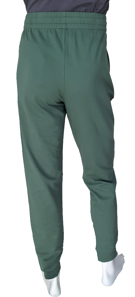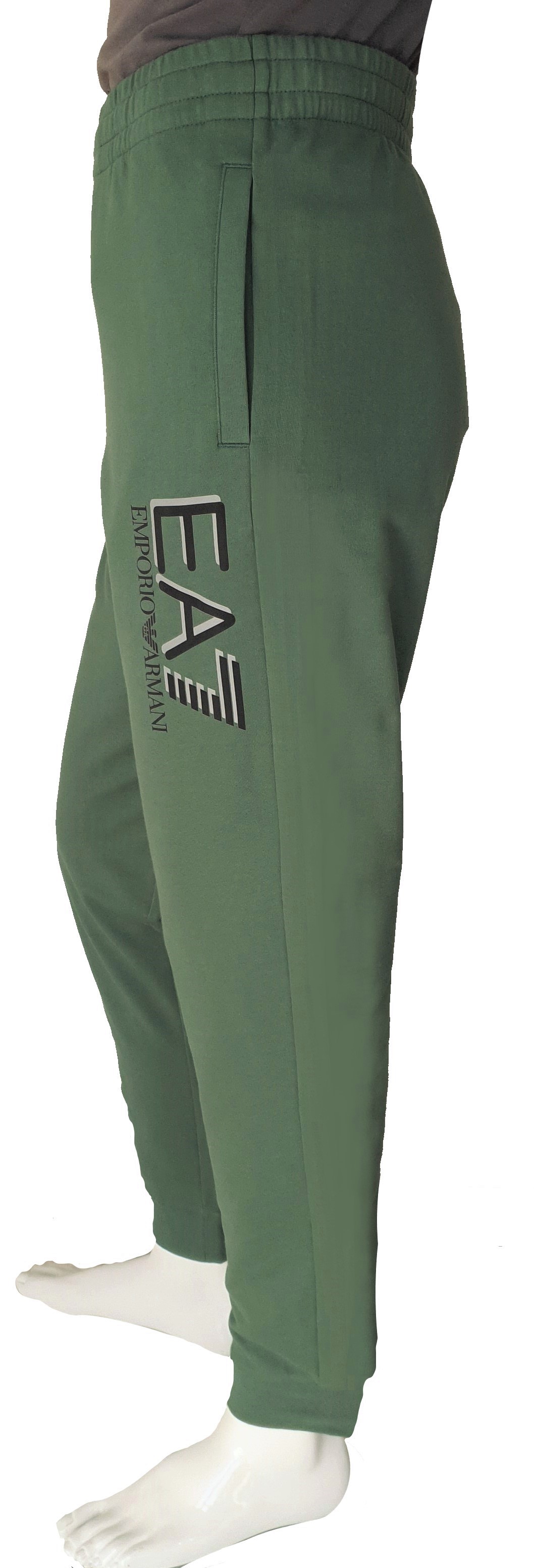 Wygodne zielone męskie spodnie dresowe Emporio Armani EA7. W pasie guma plus dodatkowo sznurek do regulacji. Z przodu dwie boczne głębokie kieszenie. Na jednej nogawce logotyp Emporio Armani EA7, w kolorze czerni i srebrzystej odblaskowej szarości. Na dole ściągacz. Z tyłu brak kieszeni. Prać w pralce 30 stopni.