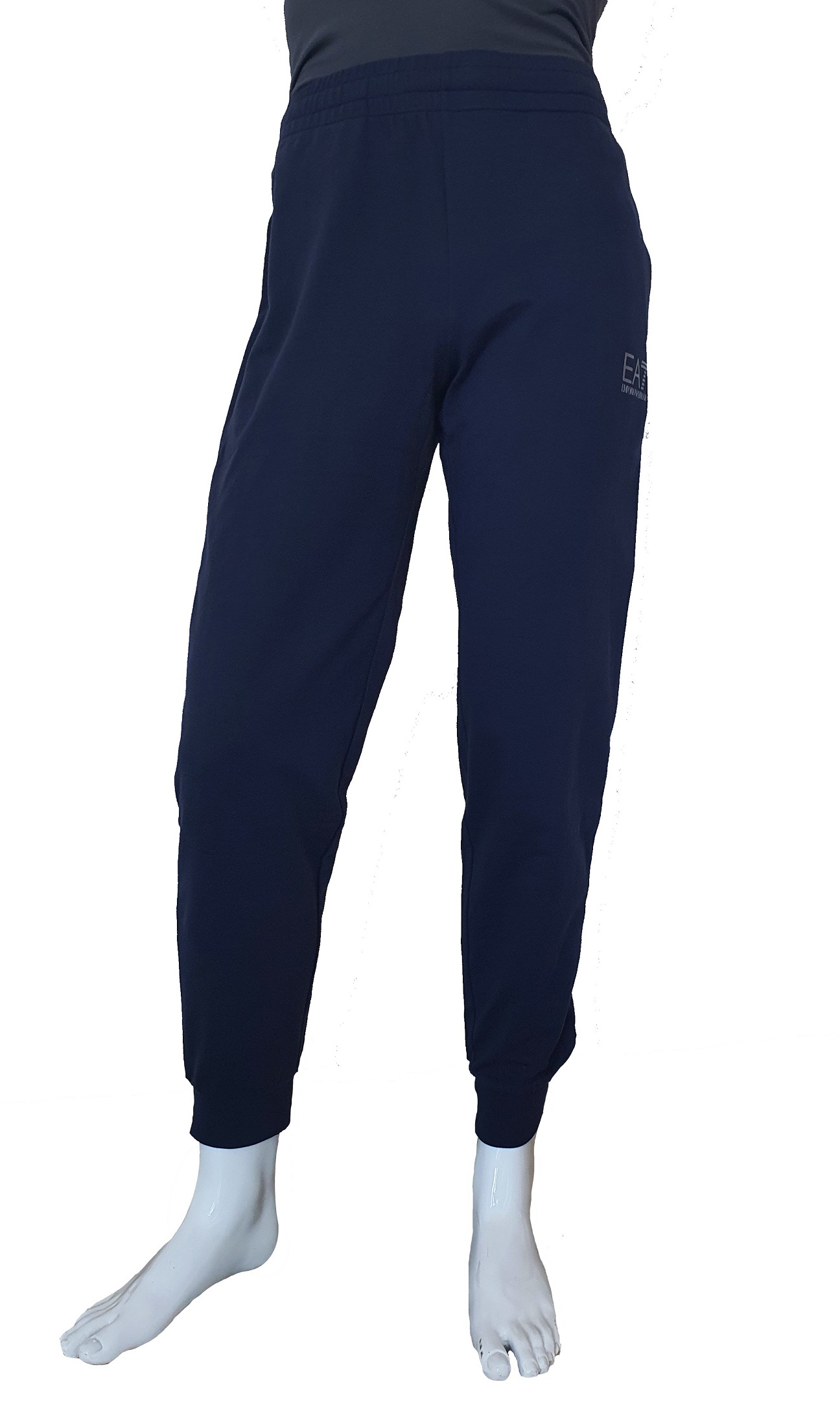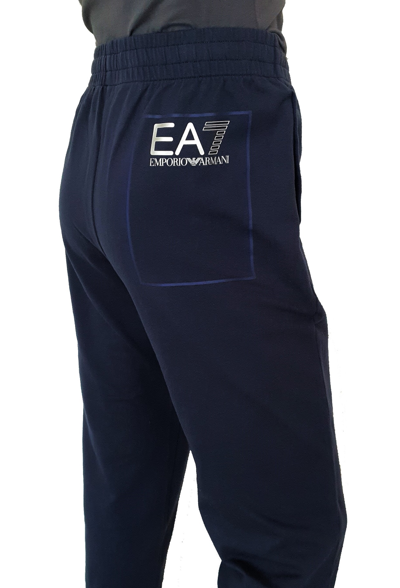 Męskie spodnie dresowe marki Emporio Armani EA7 w kolorze granatowym navy blue. W pasie gumka plus dodatkowo sznurek, wiązany od wewnątrz. Na jednej nogawce, na wysokości uda srebrny logo Emporio Armani EA7. Po bokach dwie kieszenie wewnętrzne. Z tyłu drukowana aplikacja ozdobna, która wygląda jak naszyta kieszeń z logotypem EA7. Prać w pralce w 30 stopniach.