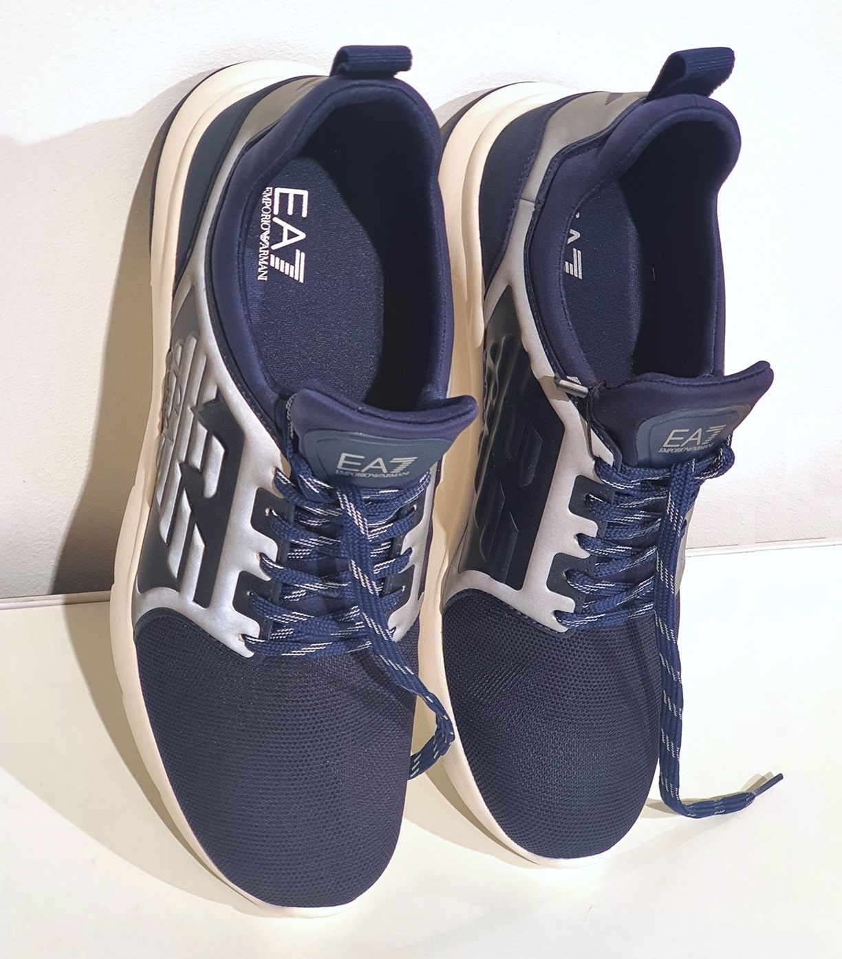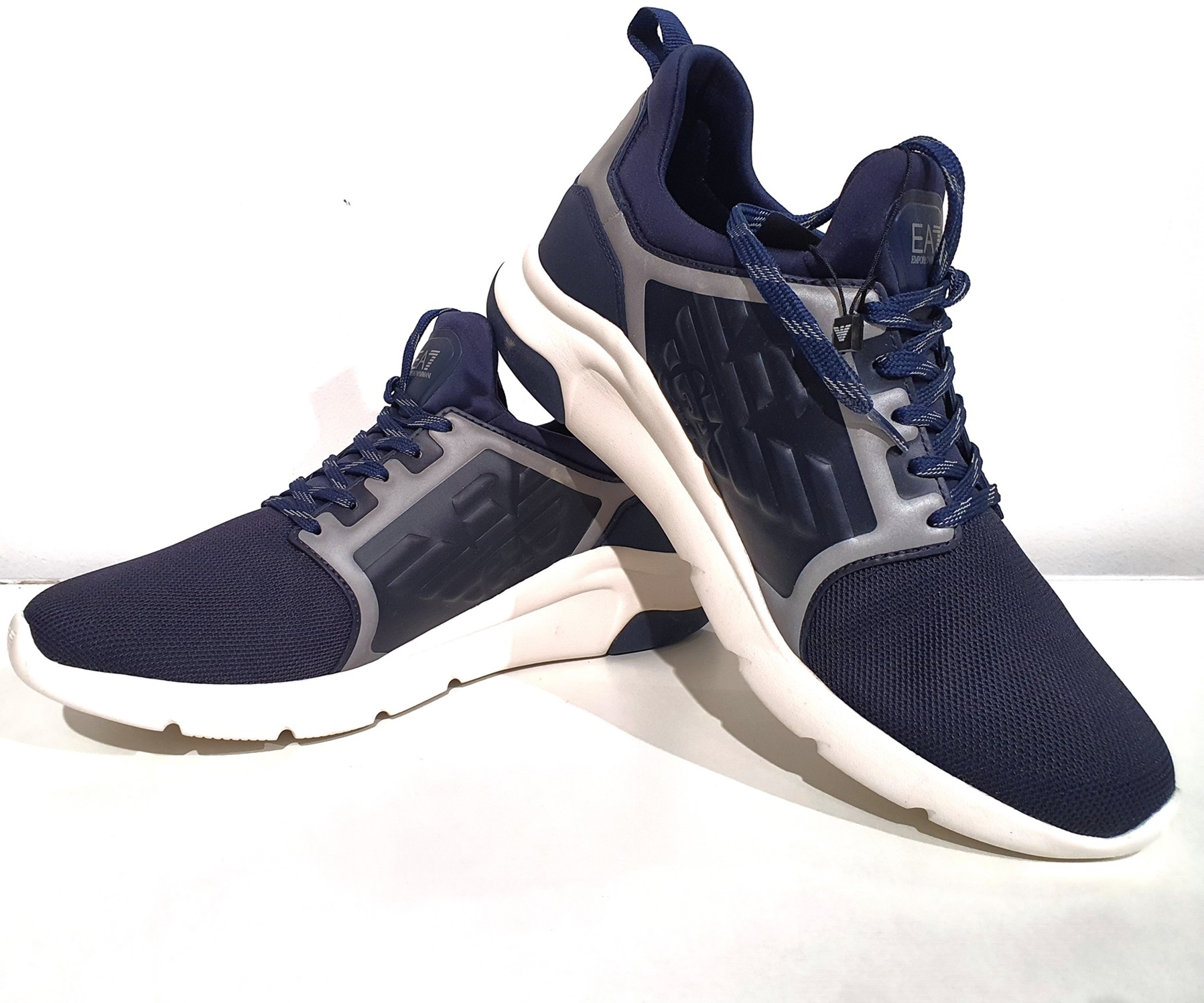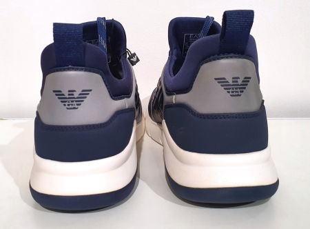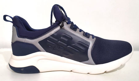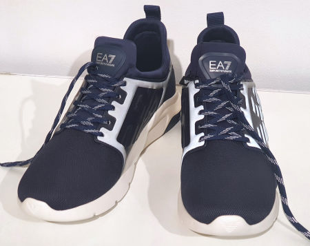 Granatowo-białe buty sportowe z linii Emporio Armani EA 7. Nieco grubsza, biało granatowa podeszwa. Po obu stronach buta motyw orła Emporio Armani. Wszystkie szare elementy buta są w nocy odblaskowe. Front buta z palcami, z odpornej granatowej tkaniny. Buty są bardzo lekkie i wygodne także na szeroką stopę.