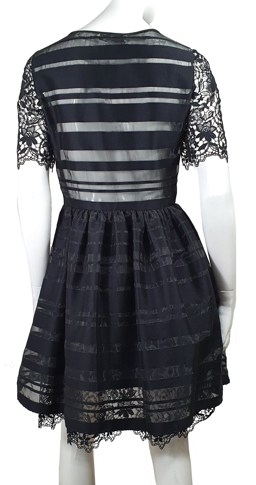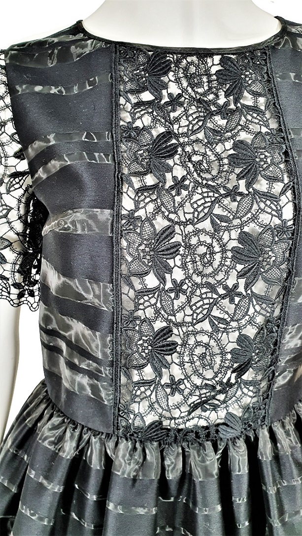 Zjawiskowa, bardzo kobieca, odmładzająca i inspirowana Sycylią sukienka włoskiej marki Blugirl, czyli "młodszej siostry" w domu mody Blumarine. Fantastyczne połączenie pasków z koronką. Ciekawa faktura materiału: naprzemiennie pasy z połyskliwego, półprzezroczystego tiulu i grubszej tkaniny, Rękawy oraz gorset zdobione koronką. Z boku zasuwana. Na niezbyt duży biust.