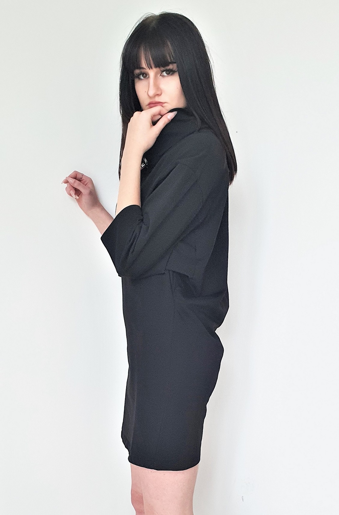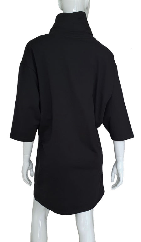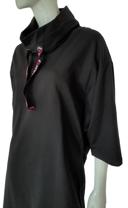 Świetna sportowa czarna dresowa sukienka Armani Exchange w kroju typu oversize. Ten krój, luźny zwłaszcza w biuście sprawia, że sukienka nadaje się dla pań z bardzo dużym biustem. Nasz outlet proponuje wyprzedaż sukienek Armani przez cały rok. Nie trzeba czekać na końcówkę sezonu. Ta sukienka Armani Exchange to niezwykle wygodny model do codziennego użytkowania nawet do pracy. Idealna na jesień wiosnę i zimę. Na nogi można założyć czarne getry i całość będzie totalnym, nowoczesnym lookiem. Wysoki luźny golf jest dekorowany wstążkami z napisem Armani Exchange. To będzie najbardziej ulubiona codzienna sukienka w Waszej szafie. Prać w 30 stopniach w pralce.