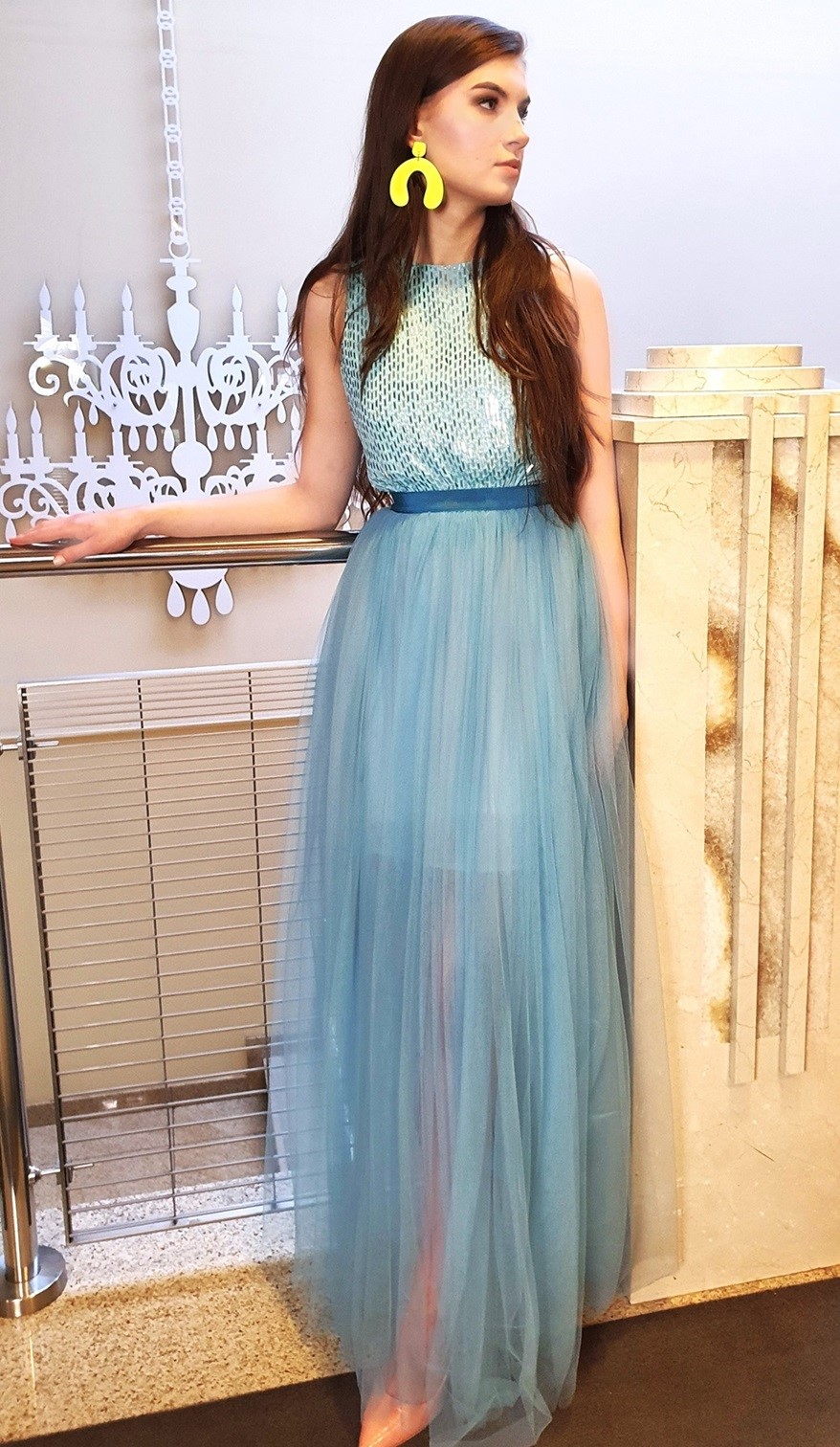 Spódnica z tiulu. Spódnica nie posiada halki ani podszewki. Gorset przypinany guzikami do spódnicy, dekorowany prostokątnymi cekinami. Sukienka na wysoką osobę