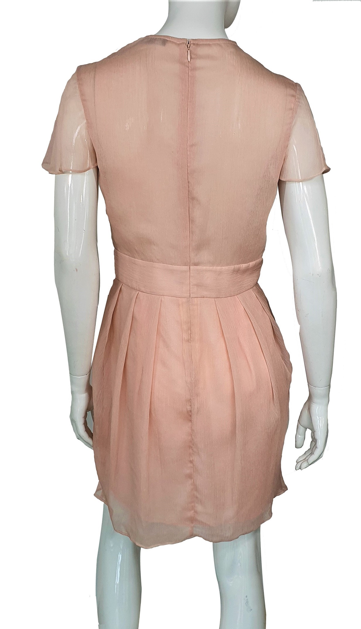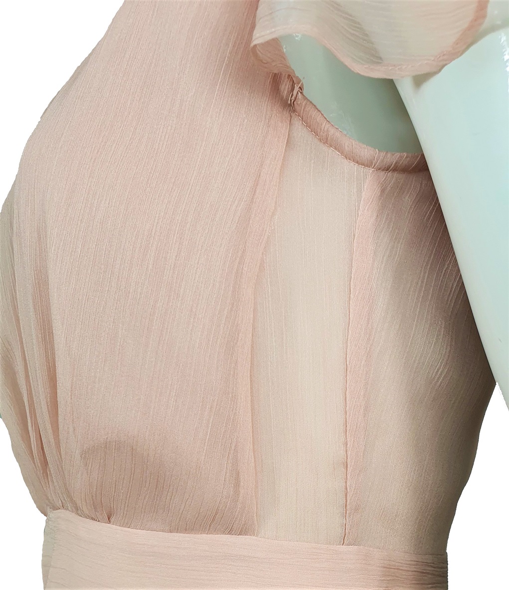 Zwiewna, delikatna, romantyczna. Sukienka idealna na wesele albo na komunię. Ta sukienka Emporio Armani kolorze pomiędzy ciepłym pudrowym różem, a beżem. to idealna propozycja dla pań o jasnym kolorze włosów i jasnej cerze. Sukienka bardzo wygodna, dwie kieszenie z po bokach. Choć materiał o ciekawej, lekko marszczonej strukturze, wygląda na bardzo delikatny, w istocie jest mocny. Sukienkę można ją prać w pralce w temperaturze 30 stopni. Krój gorsetu i warstwy tkaniny optycznie powiększają biust. Gorset sukienki uszyty jest z dwóch warstw tkaniny, co gwarantuje nieprzezroczystość sukienki. Spódnica na podszewce. Zasuwana na plecach. Nie jest elastyczna w pasie.