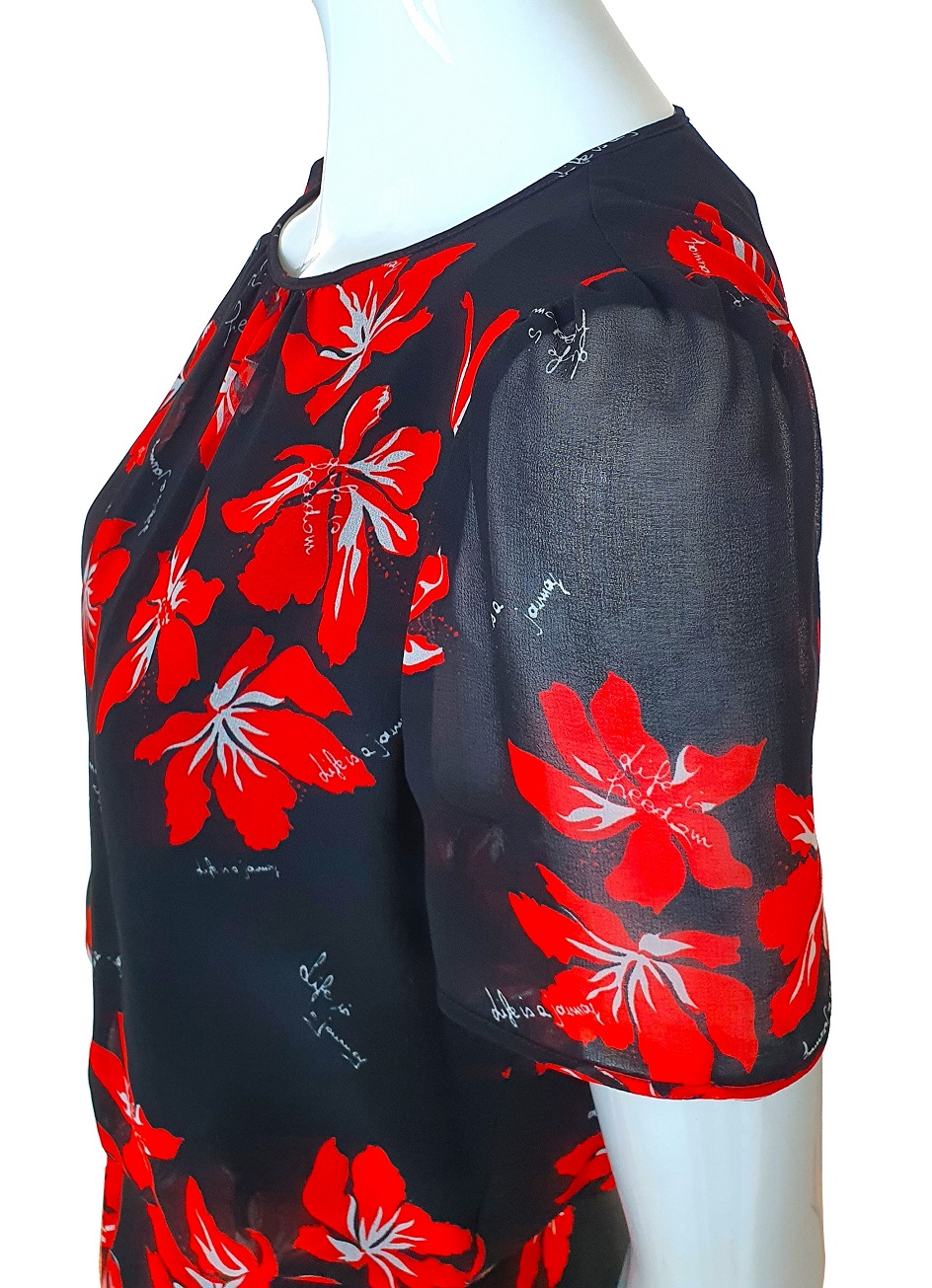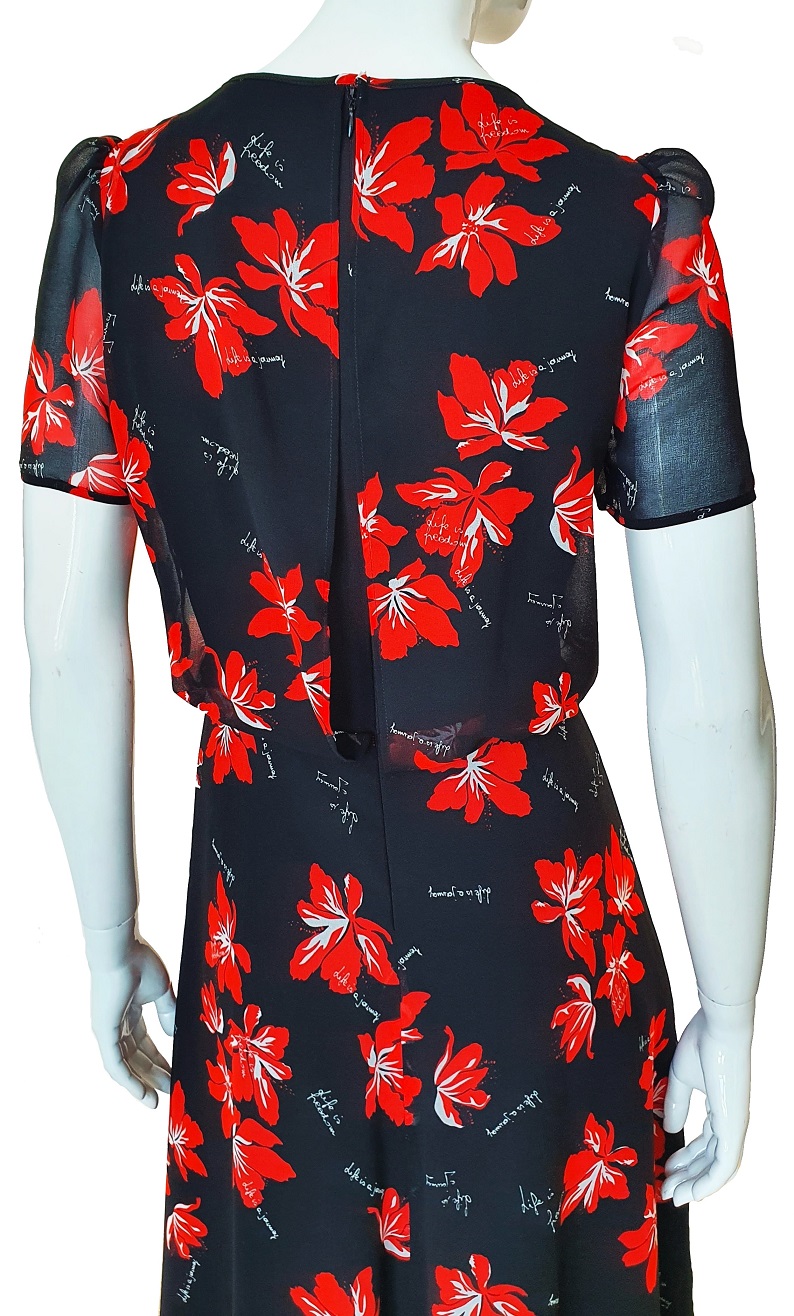Czarna sukienka w kwiaty włoskiej marki Marella. Inspirowana czernią popularnych sycylijskich sukienek, a jednocześnie bujną przyrodą tej wyspy. Nieco dłuższa. Pięknie się układa. Sukienki Marella, które oferuje w ciągłej sprzedaży nasz outlet, zarówno on - line, jak i stacjonarny, którego siedzibą są Kielce, starannie selekcjonujemy podczas zakupów, jakich dokonujemy w Mediolanie, tak aby wybrać najpiękniejsze modele, które przyciągają wzrok i są niezwykle kobiece. Ten model, cięty w pasie (ale bez gumki w pasie), charakteryzuje się piękną linią kroju, zwiewną i bardzo praktyczną tkaniną. Ciekawie uszyte, dwuwarstwowe plecy sukienki, fantazyjnie układają się na sylwetce. Z tyłu suwak. Prać w pralce w 30 stopniach.