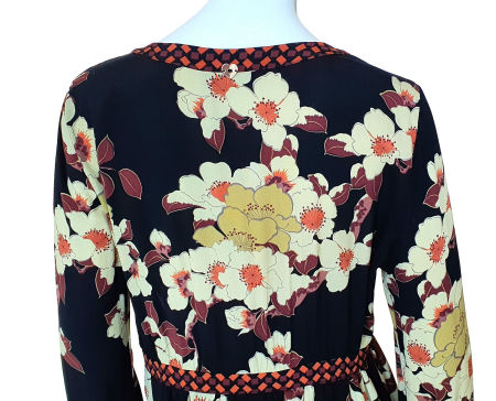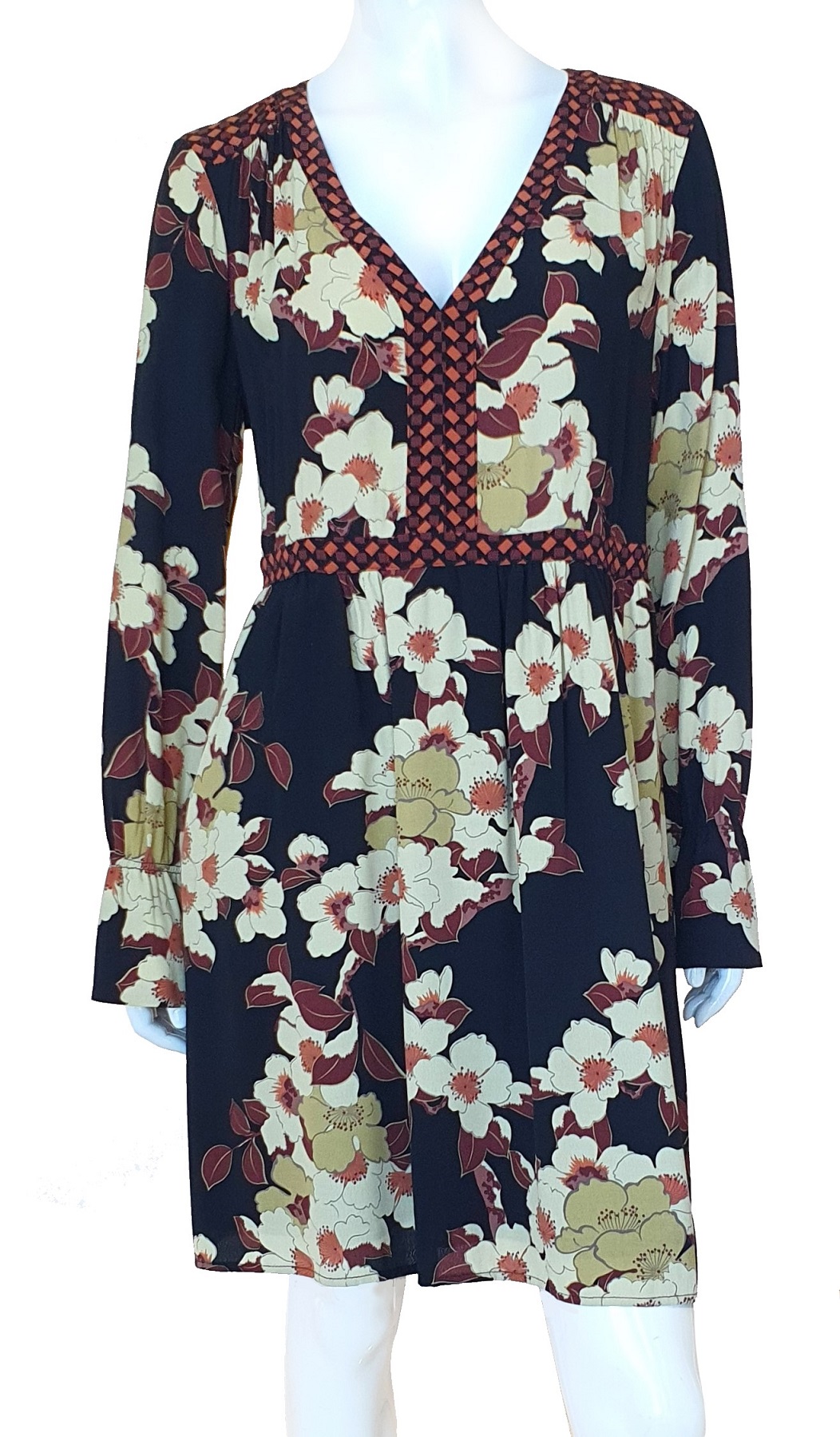Sukienka z długim rękawem włoskiej marki Twinset, w kolorach czerni, brązu i przechodzącego w złamany żółty beżu. Ciekawe łączenie motywów kwiatowych i geometrycznych. Taliowana i marszczona w pasie, ale bez wszywanej gumki w pasie. Z boku suwak. Mankiety rękawów mają wszytą gumkę, dzięki czemu można je podciągnąć nawet powyżej łokcia i nie zsuną się z powrotem, bo są podtrzymane przez gumkę. Sukienka bez podszewki z przewiewnej tkaniny.