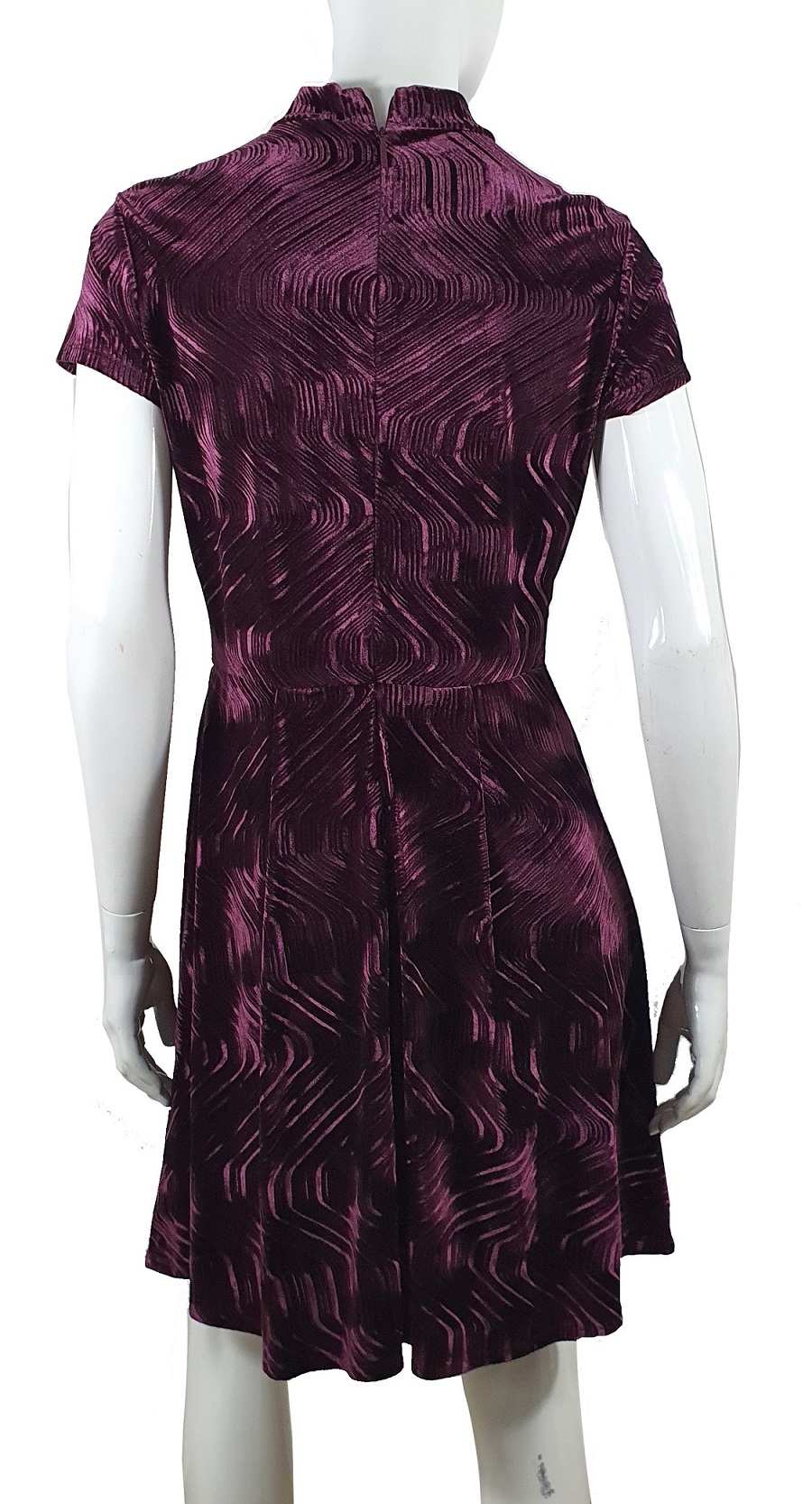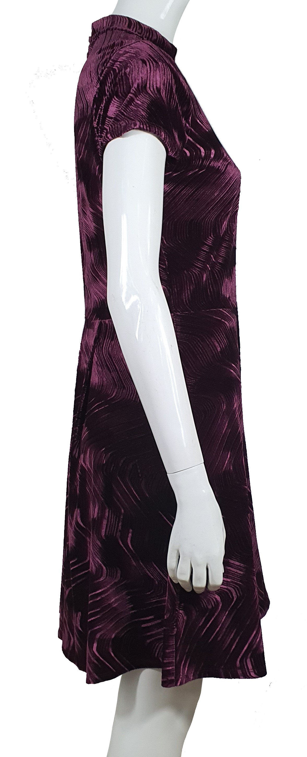 Koktajlowa sukienka z bordowego weluru marki Armani Exchange. Ciekawa faktura tkaniny welurowej, której różnej długości "włoski" tworzą wzór powtarzających się fal. Tkanina sukienki jest elastyczna i rozciągliwa co czyni ją bardzo wygodną. Z tyłu zasuwana, bez podszewki. W talii dyskretna blaszka z tłoczonym logotypem Armani Exchange.