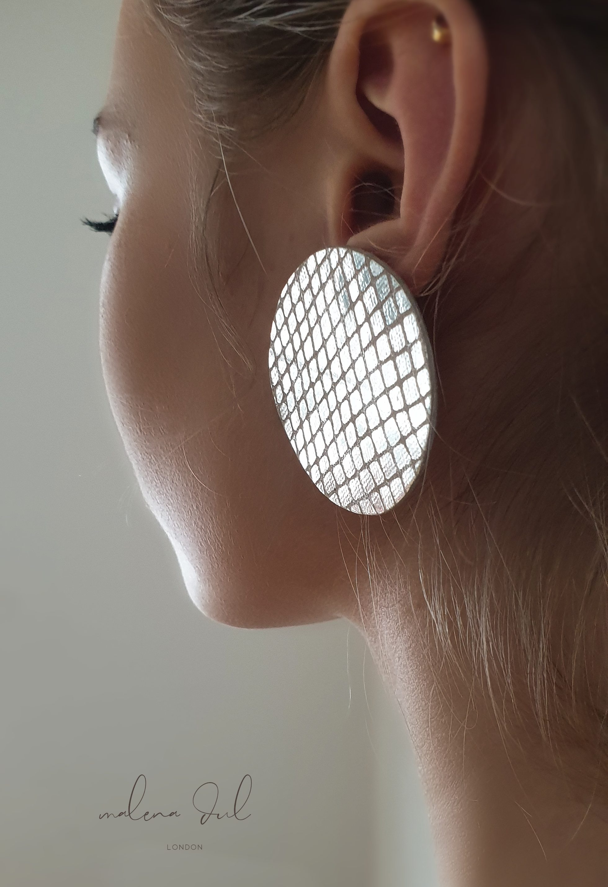 Kolekcja SUN, to spektakularne, duże, geometryczne kolczyki, wykonane ze skóry naturalnej w kolorze srebra w print skóry węża. Klasyczne i bardzo eleganckie. Swoją formą przywodzą w pamięci odważne lata 80te. Pięknie komponują się z prostymi w formie stylizacjami. Sprawdzą się jako niebanalny dodatek to sukienki, marynarki, golfu czy prostego t-shirtu i jeansow. Wygodne i lekkie. Kolczyki występują w kilku kolorach/wzorach.