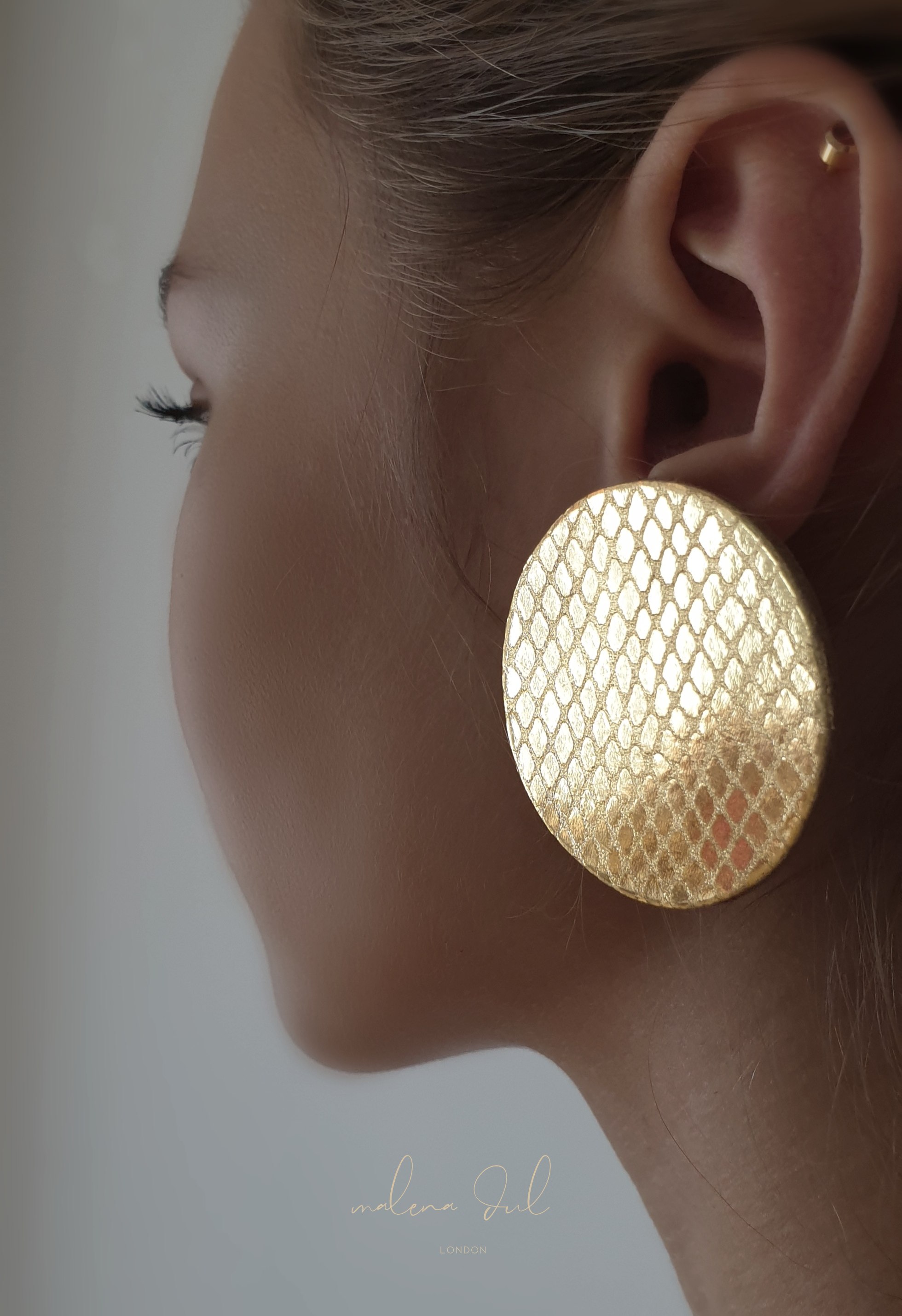 Kolekcja SUN, to spektakularne, duże, geometryczne kolczyki, wykonane ze skóry naturalnej w kolorze ciepłego złota w print skóry węża. Klasyczne i bardzo eleganckie. Swoją formą przywodzą w pamięci odważne lata 80te. Pięknie komponują się z prostymi w formie stylizacjami. Sprawdzą się jako niebanalny dodatek to sukienki, marynarki, golfu czy prostego t-shirtu i jeansow. Wygodne i lekkie. Kolczyki występują w kilku kolorach/wzorach.