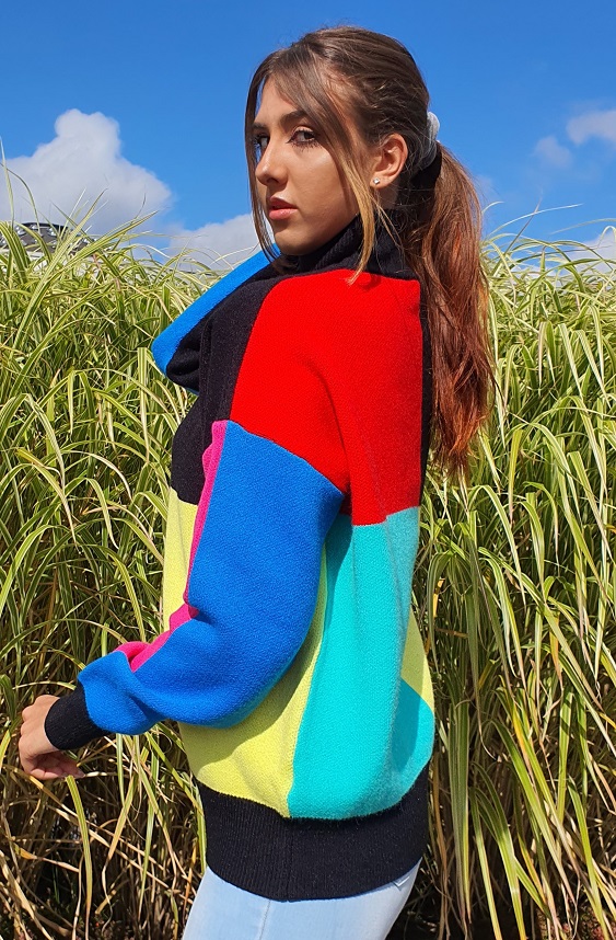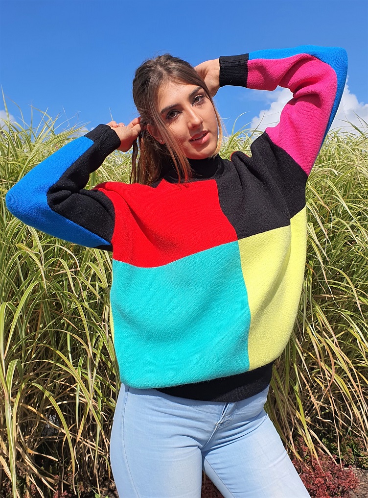Wielokolorowy golf Odi Odi. Ta włoska, mało znana w Polsce niszowa marka, słynie z nietuzinkowych projektów o szerokim spektrum: począwszy od takich właśnie grubych zimowych swetrów, bo delikatne, zwiewne i niezwykle kobiece balowe suknie. Ten gruby, mocno oversizowe'y golf jest idealny dla kobiet pewnych siebie, które kochają kolor i nie chcą ginąć w tłumie tak samo ubranych innych kobiet. Sweter jest dość gęsto tkany, ale zastosowana w nim dzianina jest mocno elastyczna. Miły w dotyku, nie drapiący. Prać chemicznie. Modelka w rozmiarze 36 i wzroście 180 cm, ma na sobie rozmiar M