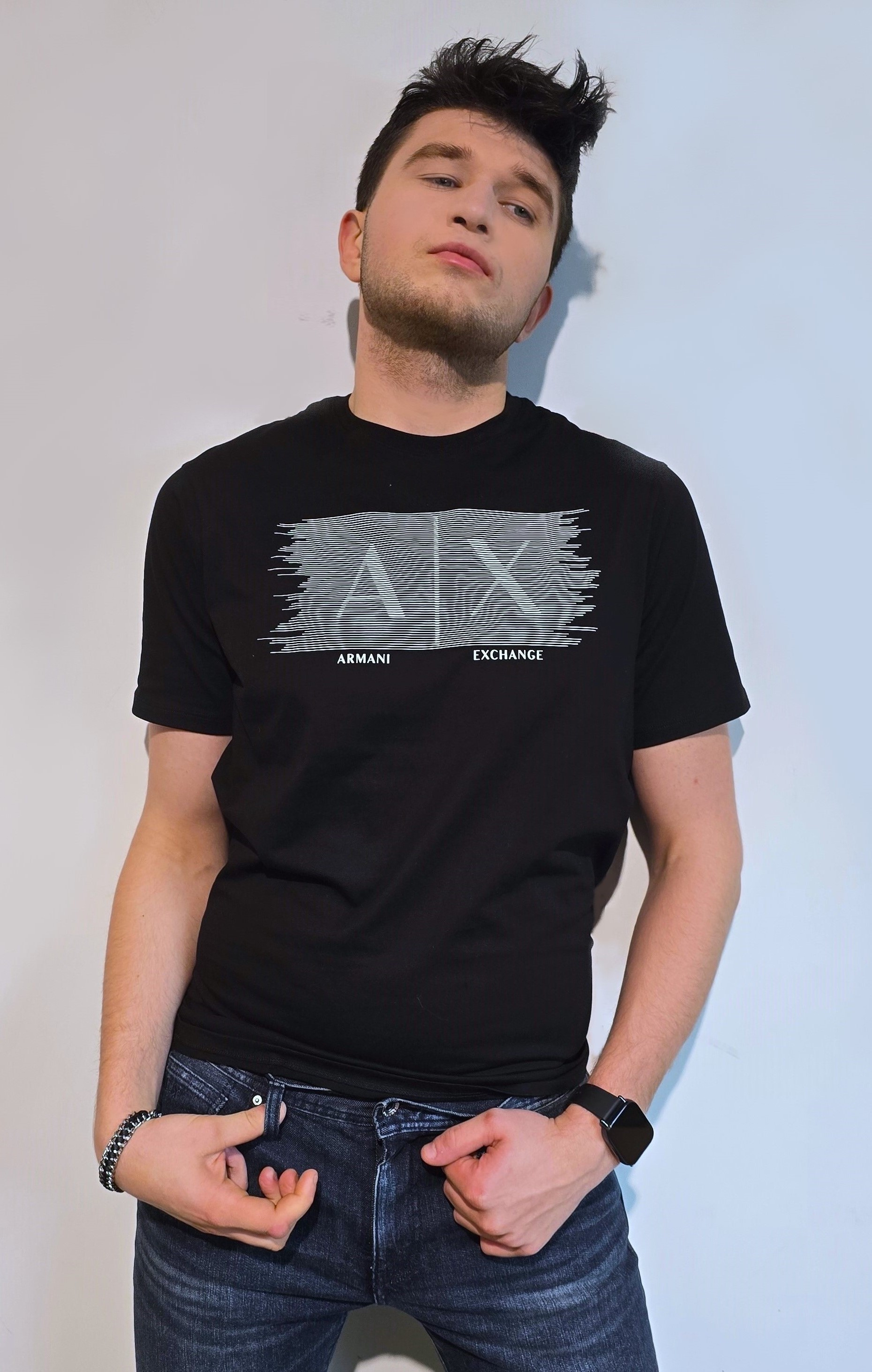 Czarny t-shirt Armani Exchange. Na froncie stylizowane logo Armani Exchange. Z tyłu bez napisów. Prać w pralce w 30 stopniach.
