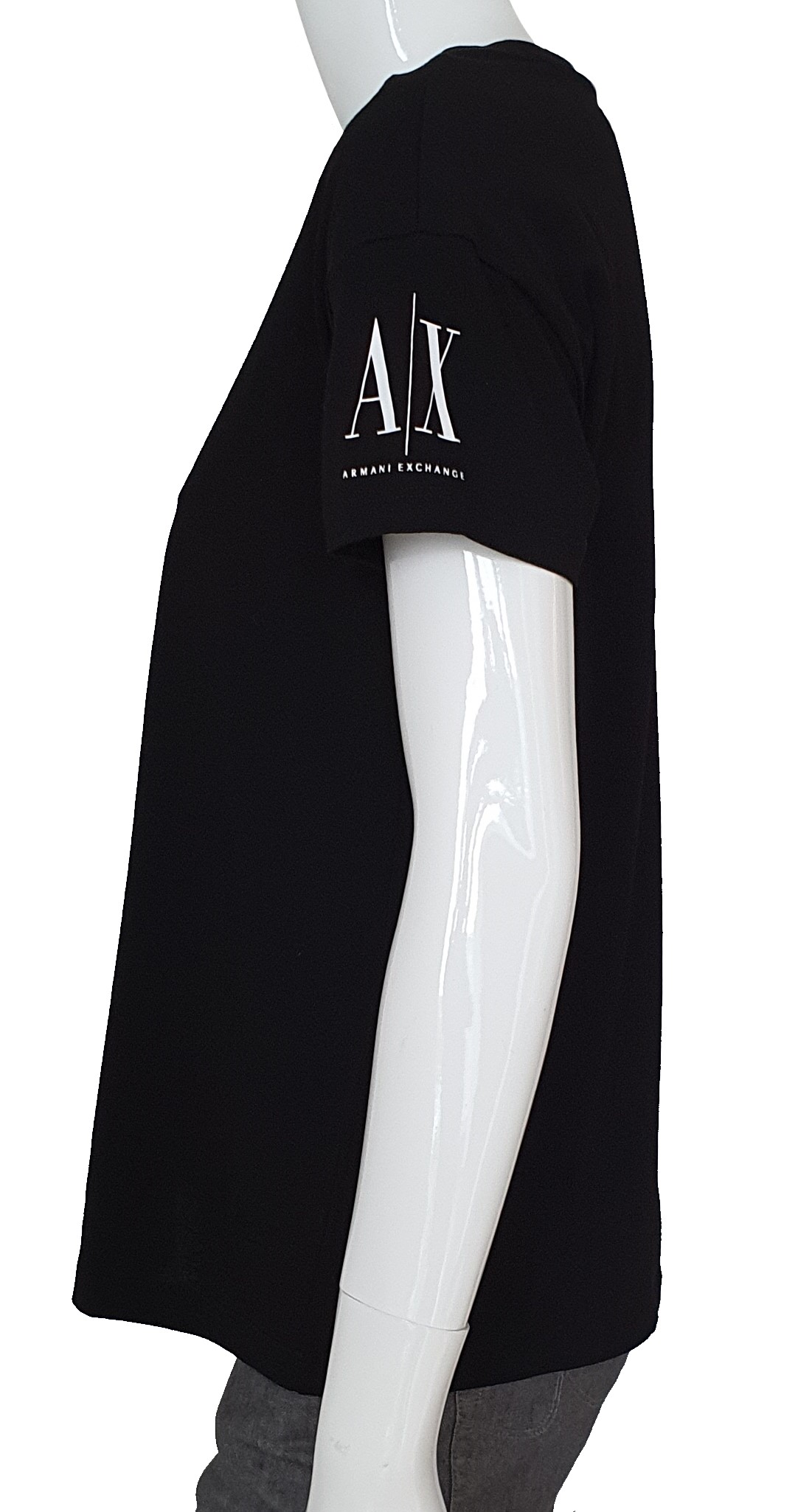 Czarny damski t-shirt marki Armani Exchange. Z tyłu głądki. Z przodu czarno-biała grafika z napisem "I need you". Na prawym rękawie drukowany biały logotyp Armani Exchange.