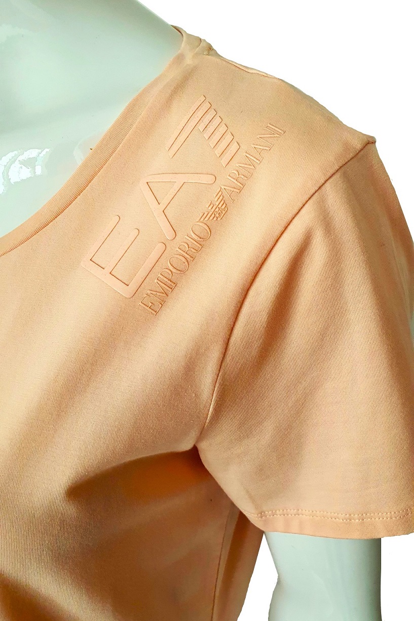 Damski t - shirt Emporio Armani EA7 w kolorze brzoskwiniowym określonym przez producenta jako "pale peach". Gładki, na jednym z ramion naklejane, lekko wypukłe, gumowane, błyszczące logo EA7 w tym samym kolorze co koszulka. Tkanina nieco bardziej elastyczna niż sama bawełna. Można prać w pralce w 30 stopniach.